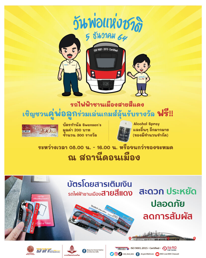 รถไฟฟ้าชานเมืองสายสีแดงมอบของขวัญในวันพ่อแห่งชาติ วันที่ 5 ธันวาคม 2564 จัดกิจกรรมพิเศษให้คุณพ่อคุณลูกได้ร่วมสนุกลุ้นรับบัตรของขวัญจากร้านไอศกรีม Swensen’s มูลค่า 200 บาท และรางวัลอื่นๆอีกมากมายกว่า 1,000 รางวัล ที่สถานีรถไฟฟ้าดอนเมือง