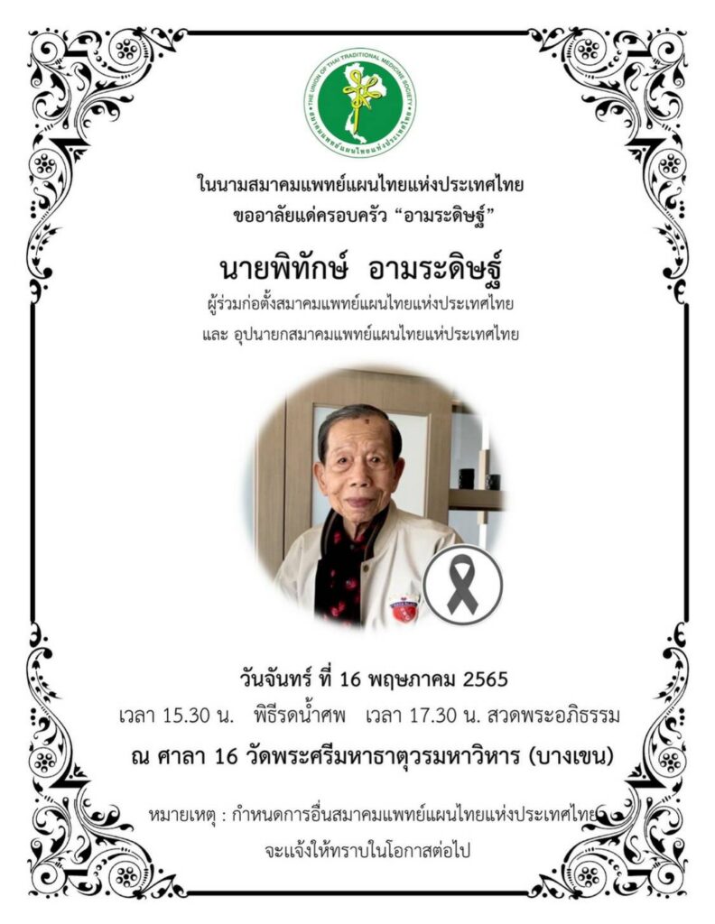 ด้วยคุณความดีและคุณูปการที่นายพิทักษ์ อามระดิษฐ์ ผู้วายชนม์ ท่านได้ทำไว้เมื่อยังมีชีวิต เป็นผู้ร่วมก่อตั้งสมาคมแพทย์แผนไทยแห่งประเทศไทยในปี 2540 และอุปนายกสมาคมแพทย์แผนไทยแห่งประเทศไทย ท่านเป็นผู้ที่วางระบบโครงสร้างการบริหารจัดการงานของสมาคมฯ โครงสร้างการจัดทำหลักสูตรอบรมต่างๆรวมถึงการวางระเบียบการออกหนังสือเอกสาร ในรูปแบบราชการ . 🙏จึงขอกราบเรียนเชิญคณะกรรมการบริหาร ผู้อำนวยการศูนย์สมาคมฯ ร่วมไว้อาลัย และร่วมเป็นเจ้าภาพสวดพระอภิธรรมศพ นายพิทักษ์ อามระดิษฐ์ ในวันเวลาและสถานที่ดังกล่าว สมาคมแพทย์ไทยขอกราบขอบพระคุณทุกท่านเป็นอย่างสูงมา ณ โอกาสนี้