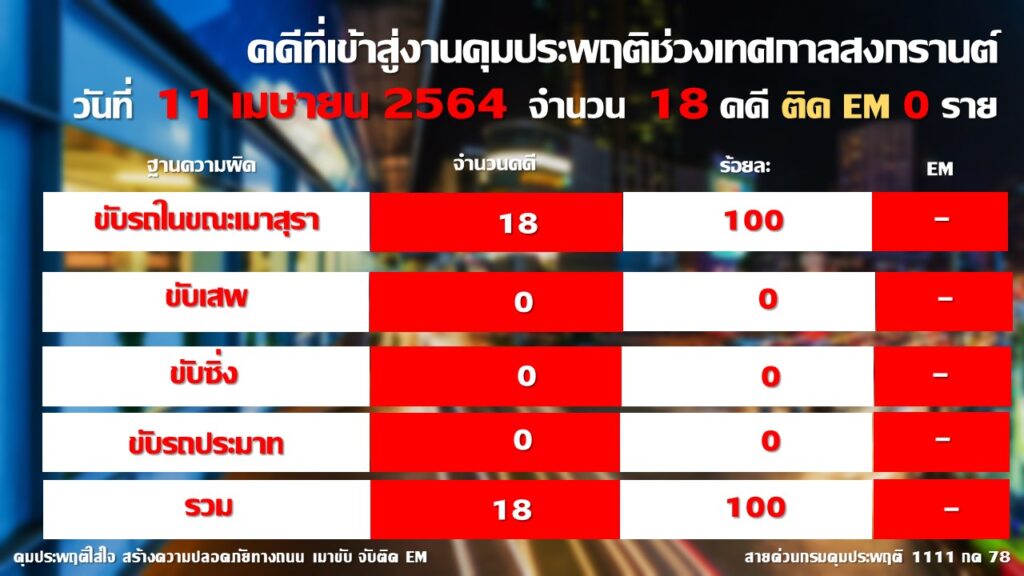 นอกจากนี้ ในส่วนของการติดอุปกรณ์อิเล็กทรอนิกส์ติดตามตัว หรือกำไล EM กับผู้กระทำผิดเมาแล้วขับยังไม่มีเพิ่มเติม ยังคงตัวเลขสะสม 2 วันอยู่ที่ จำนวน 1 ราย โดยมีเงื่อนไขห้ามออกจากที่พักอาศัย ในช่วงเวลาตั้งแต่ 22.00 น. – 04.00 น. เป็นระยะเวลา 15 วัน ทั้งนี้ สำนักงานคุมประพฤติทั่วประเทศเฝ้าติดตามและควบคุมดูแลผู้กระทำผิดตลอด 24 ชั่วโมงผ่านศูนย์ควบคุมอิเล็กทรอนิกส์ติดตามตัว (Electronic Monitoring Control Center – EMCC) พร้อมประสานเครือข่ายภาคประชาชน อาสาสมัครคุมประพฤติ เตรียมพร้อมลงพื้นที่หากมีการผิดเงื่อนไขคุมความประพฤติ