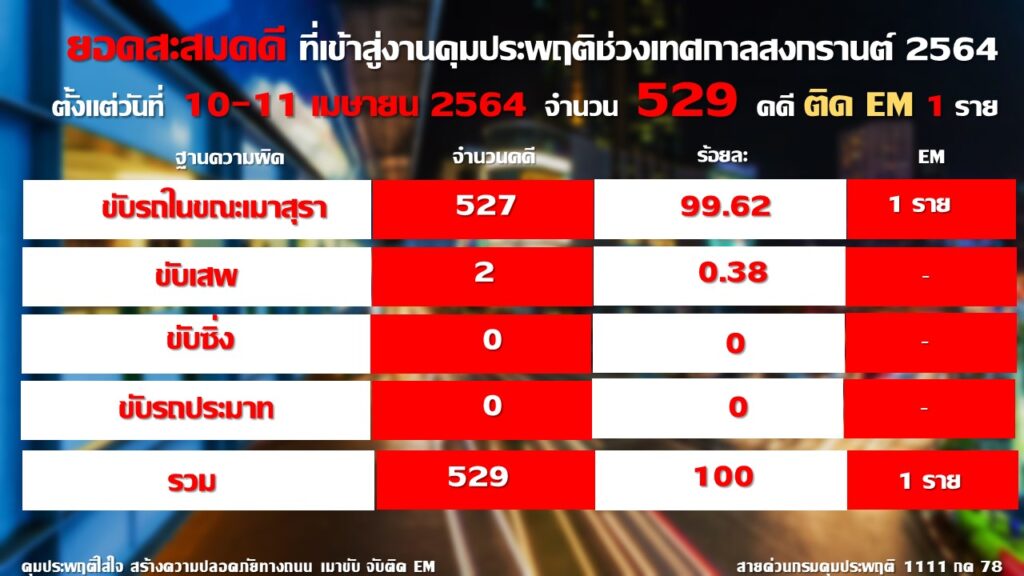 คดีขับรถขณะเมาสุรา จำนวน 527 คดี คิดเป็นร้อยละ 99.62