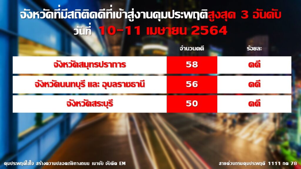 จังหวัดที่มีสถิติคดีขับรถในขณะเมาสุราสูงสุด 3 อันดับ ได้แก่ 1. จังหวัดสมุทรปราการ จำนวน 58 คดี 2.จังหวัดนนทบุรีและจังหวัดอุบลราชธานี จำนวน 56 คดี และ 3. จังหวัดสระบุรี จำนวน 50 คดี