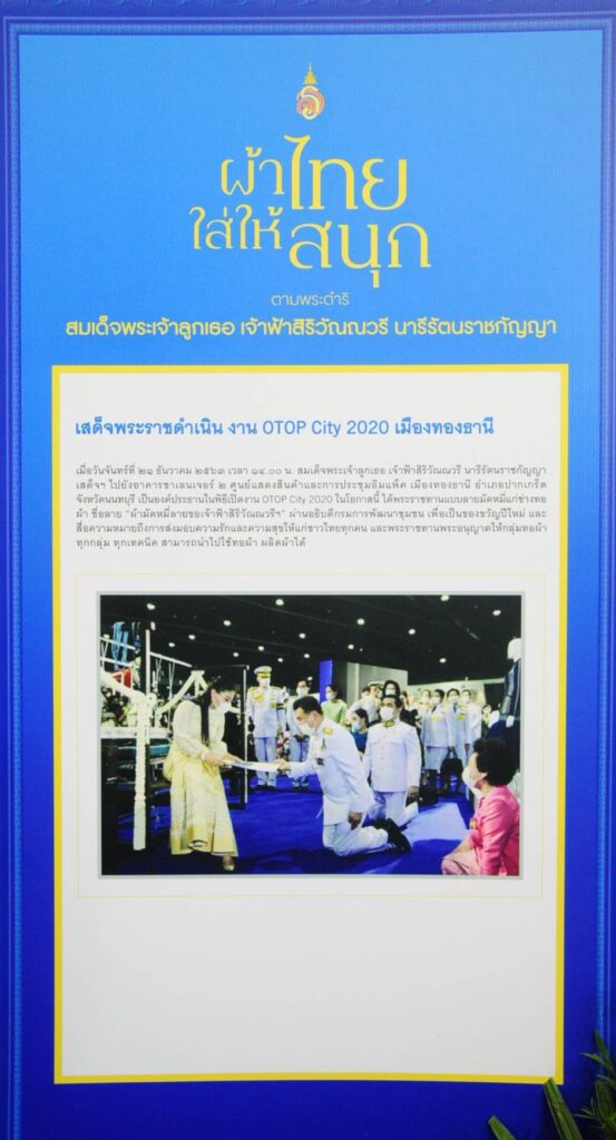 เมื่อครั้งเสด็จเป็นองค์ประธานในพิธีเปิดงาน OTOP City 2020 เมื่อวันจันทร์ที่ 21 ธันวาคม 2563 เวลา 14.00 น. ณ อาคารชาเลนเจอร์ 2 ศูนย์แสดงสินค้าและการประชุม อิมแพ็ค เมืองทองธานี อำเภอปากเกร็ด จังหวัดนนทบุรี เพื่อเป็นของขวัญปีใหม่ และสื่อความหมายถึงการส่งมอบความรักและความสุขให้แก่ชาวไทยทุกคน และพระราชทานพระอนุญาตให้กลุ่มทอผ้าทุกกลุ่ม ทุกเทคนิค สามารถนำไปทอผ้า ผลิตผ้าได้ ซึ่งกรมการพัฒนาชุมชนได้ส่งมอบลายผ้าพระราชทานต่อให้กับกลุ่มทอผ้าใน 76 จังหวัด ได้นำไปเป็นต้นแบบและพัฒนาต่อยอดไปสู่เครื่องแต่งกาย เครื่องประดับ ตามวิถีที่เป็นเอกลักษณ์ประจำถิ่น ตามพระดำริ “ผ้าไทยใส่ให้สนุก”