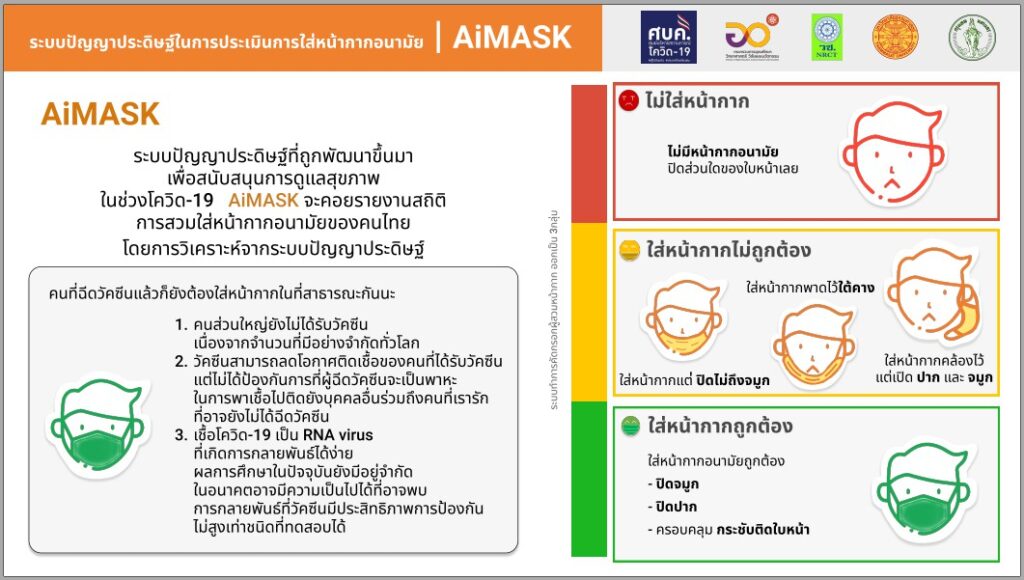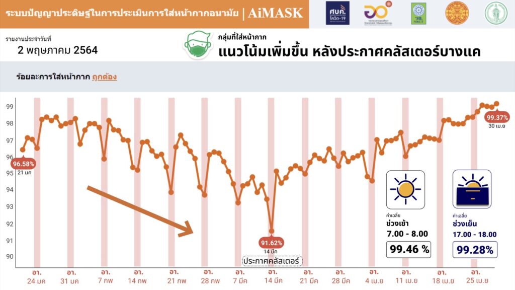 ตามที่ได้มีการยกระดับมาตรการควบคุมการติดเชื้อโควิด-19 ที่ยังคงมีการระบาดอยู่ตั้งแต่ช่วงต้นเดือนเมษายนที่ผ่านมาและมีผู้ติดเชื้อจำนวนมาก กระทรวงการอุดมศึกษา วิทยาศาสตร์ วิจัยและนวัตกรรม (อว.) ได้รายงานผลการติดตามการใส่หน้ากากอนามัย โดยใช้ระบบปัญญาประดิษฐ์ (เอไอ) แบบเรียลไทม์ โดยเอสไอไอที มหาวิทยาลัยธรรมศาสตร์ ร่วมกับสำนักงานการวิจัยแห่งชาติ (วช.) พบว่าในขณะนี้คนกรุงเทพใส่หน้ากากอนามัยในที่สาธารณะสูงถึง 99.37% ซึ่งเป็นสถิติที่สูงที่สุดเท่าที่ได้ประเมินการให้ความร่วมมือใส่หน้ากากอนามัย โดยมีผู้ที่ไม่ใส่หน้ากากหรือใส่ไม่ถูกต้องรวมกันเพียง 0.63% หรือเท่ากับมีผู้ที่ไม่ใส่หน้ากากอนามัยเพียง 2 ใน 1000 คน และใส่แต่ไม่ถูกต้องเพียง 4 ใน 1000 คนเท่านั้น