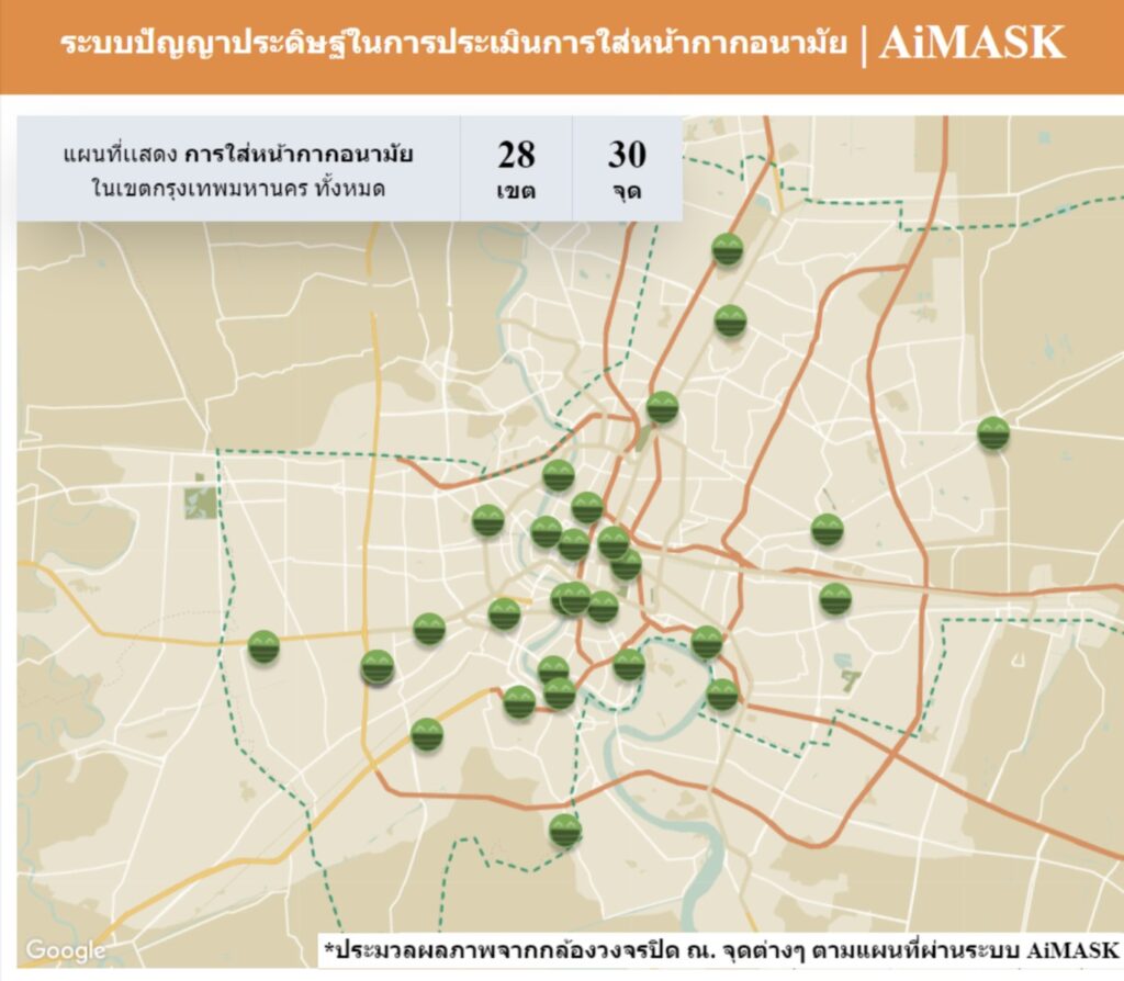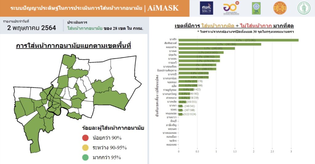 ศ.ดร.ธนารักษ์ ธีระมั่นคง สถาบันเทคโนโลยีนานาชาติสิรินธร (SIIT) มหาวิทยาลัยธรรมศาสตร์ รายงานว่า “ข้อมูลเล่าสุดได้ประเมินแบบอัตโนมัติในประชากร 11,894 คน เมื่อวันที่ 30 เมษายน 2564 จาก 30 จุด ใน 28 เขตทั่วกรุงเทพมหานคร โดยทุกจุดมีผู้ใส่หน้ากากอนามัยมากกว่า 95% และมี 8 จุดในเขตยานนาวา มีนบุรี ภาษีเจริญ พระนคร บางคอแหลม ดอนเมือง จตุจักร และคลองเตย ประชาชนที่สัญจรไปมาได้ใส่หน้ากากอนามัย 100% แล้ว”