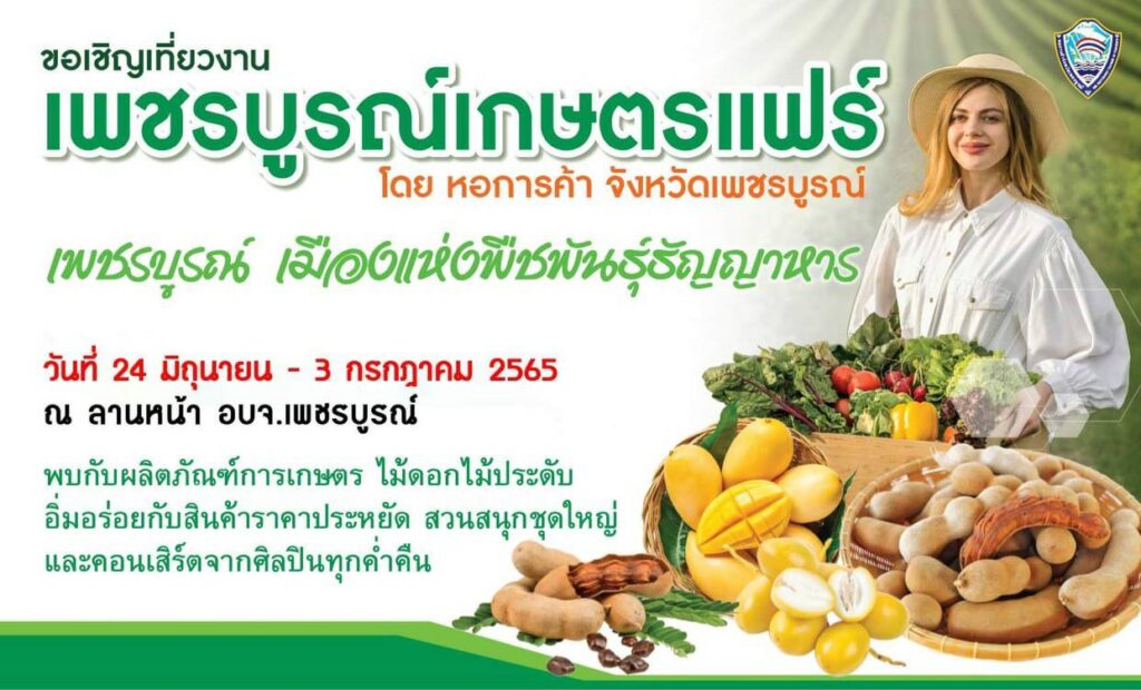 อนึ่ง การจัดงาน “เพชรบูรณ์เกษตรแฟร์ ปี 2565 เพชรบูรณ์เมืองแห่งพืชพันธุ์ธัญญาหารนั้นจัดขึ้นเพื่อส่งเสริมการกระตุ้นเศรษฐกิจภายในจังหวัด ซึ่งเป็นการจัดขึ้นโดยหอการค้าจังหวัดเพชรบูรณ์เป็นครั้งแรก ช่วยส่งเสริมเศรษฐกิจภาคการเกษตร ซึ่งจะเป็นประโยชน์ต่อเกษตรกรในพื้นที่ในการกระจายสินค้าสร้างรายได้ กระตุ้นและฟื้นฟูเศรษฐกิจให้กับเกษตรกร เนื่องจากเพชรบูรณ์เป็นเมืองแห่งเกษตรกรรม มีพื้นที่เพาะปลูกราว 2 ล้านกว่าไร่ ดังนั้นเพชรบูรณ์จึงเต็มไปด้วยพืชพันธุ์ธัญญาหาร มีพืชเศรษฐกิจมากมายหลายชนิด ซึ่งกิจกรรมภายในงานนั้น มีการแสดงรวมทั้งจัดจำหน่ายสุดยอดผลิตภัณฑ์การเกษตรของจังหวัด มีร้านค้า ร้านอาหาร สินค้าแปรรูปอีกมากมาย รวมไปถึงสินค้าข้าวของเครื่องใช้ราคาถูก และสวนสนุก ดนตรีที่มีศิลปินทุกค่ำคืน และอีกกิจกรรมที่จะสร้างสีสันภายในงานวันที่ 3 กรกฎาคม ซึ่งเป็นวันสุดท้ายของงาน จะได้พบกับการประกวด มิสหอการค้า ด้วย ![]()
