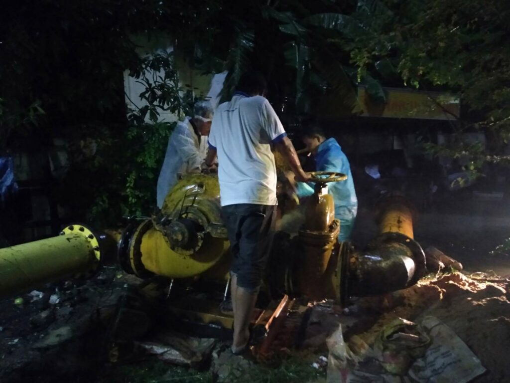 ตอนหัวค่ำเจ้าหน้าที่ชลประทานพร้อมเครื่องสูบน้ำลงพื้นที่ติดตั้งและเริ่มสูบน้ำกันคืนนั้นเลย