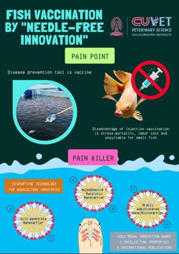 เวที “Seoul International Invention Fair 2021” (SIIF 2021) จัดขึ้นระหว่างวันที่ 1 – 4 ธันวาคม 2564 ณ กรุงโซล สาธารณรัฐเกาหลี ทาง วช. และหน่วยงานที่เกี่ยวข้องได้ส่งผลงานเข้าร่วมการประกวดสิ่งประดิษฐ์และนวัตกรรม โดย รองศาสตราจารย์ นายสัตวแพทย์ ดร.ชาญณรงค์ รอดคำ และคณะ จากจุฬาลงกรณ์มหาวิทยาลัย เป็นนักวิจัย/นักประดิษฐ์ไทยที่คว้ารางวัล Grand Prize จากผลงาน “การทำวัคซีนปลาด้วยนวัตกรรมแบบไร้เข็ม” ทางนักวิจัยเล็งเห็นปัญหาจากการฉีดวัคซีนแบบรายตัว ที่ทำให้เกิดการเสียหายและส่งผลเสียต่อปลา จึงได้คิดค้นนวัตกรรมจากองค์ความรู้ทางนาโนเทคโนโลยีประยุกต์ เพื่อเพิ่มประสิทธิภาพการห่อหุ้มและนำส่งแอนติเจนของเชื้อก่อโรคในปลา และยังเพิ่มประสิทธิภาพในการดูดซึมและการเกาะติดเยื่อเมือก ทำให้สามารถใช้วัคซีนในรูปแบบแช่หรือกิน ทั้งยังถูกหลักสวัสดิภาพของสัตว์