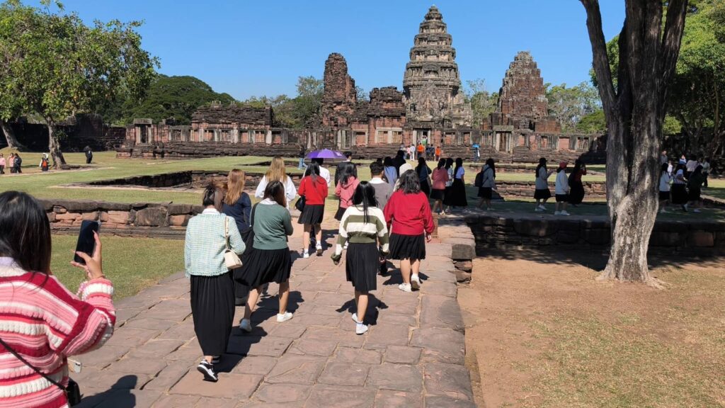 นครราชสีมา-นักท่องเที่ยวทั้งชาวไทยและชาวต่างชาติแห่เที่ยวปราสาทหินพิมายสัมผัสอากาศหนาวเย็นยามเช้ากันอย่างคึกคัก