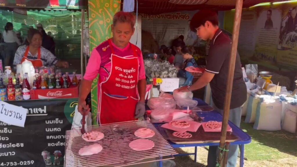 จากนั้นก็นำมาต้มประมาณ1ชม.ใส่เครื่องปั่นให้ได้แป้ง นำมาหมักใส่ส่วนผสม เกลือ กะทิ กล้วย ข้าวโพด มะพร้าวอ่อน ผสมให้เข้ากัน รสชาติปรุงตามชอบ เสร็จแล้วตักใส่ใบตองกล้วยทับเป็นแผ่นนำไปย่างไฟอ่อน ส่วนแป้งจี้ใส่เกลือและกะทิปั้นเป็นก้อนปีบแบนๆให้เป็นแผ่นบางๆน้ำขึ้นย่างไฟ พอแป้งสุกจะออกสีเหลือง หอมอร่อย แป้งนุ่ม ขายในราคา 3 แผ่น 20 บาท