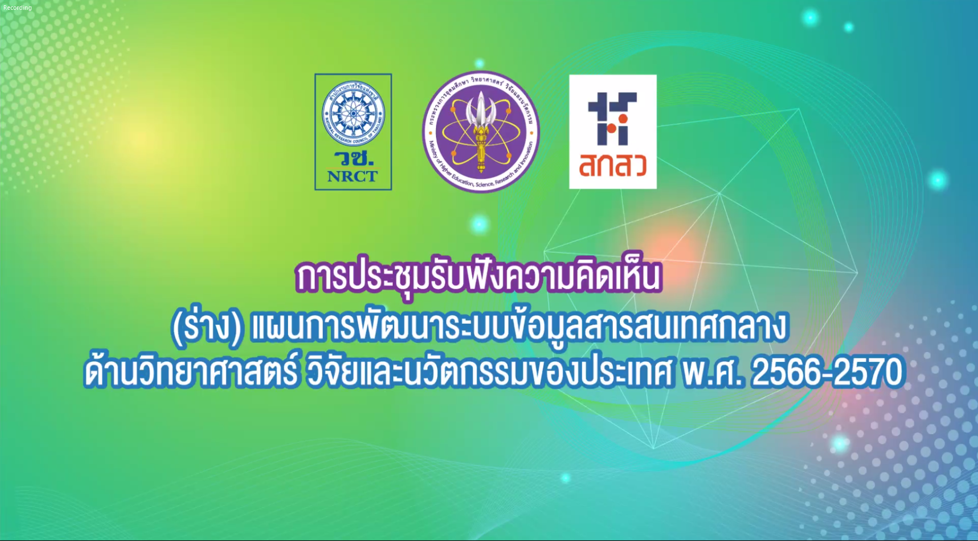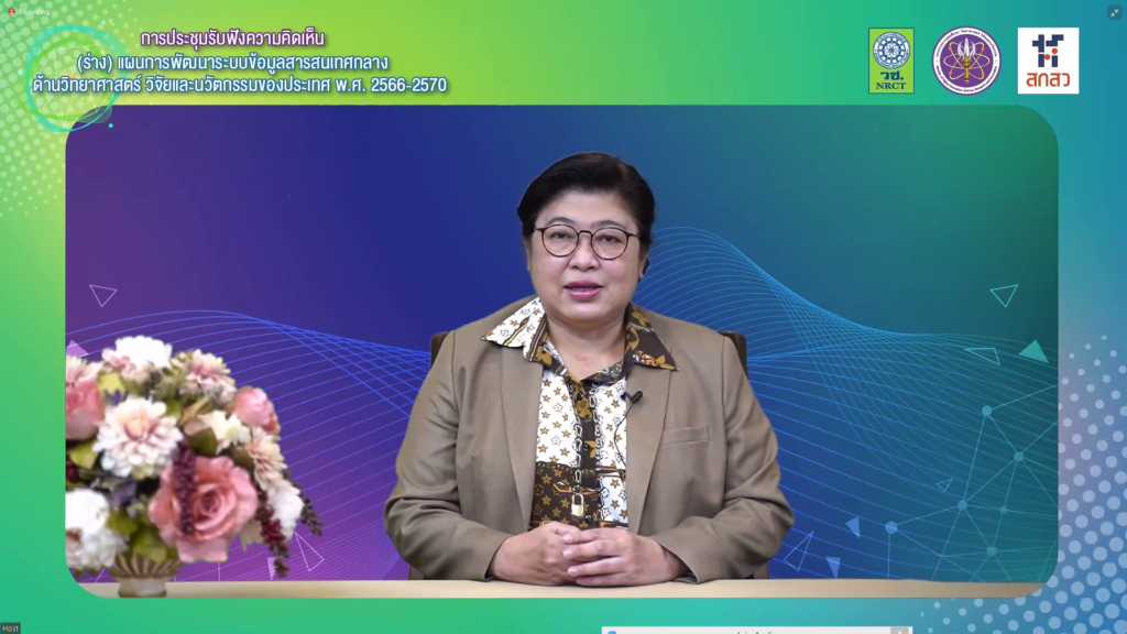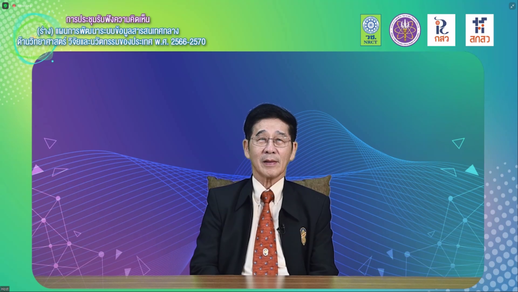 วันที่ 23 ธันวาคม 2564 สำนักงานการวิจัยแห่งชาติ (วช.) ภายใต้กระทรวงการอุดมศึกษา วิทยาศาสตร์ วิจัยและนวัตกรรม (อว.) จัดประชุมรับฟังความคิดเห็น (ร่าง) แผนการพัฒนาระบบข้อมูลสารสนเทศกลางด้านวิทยาศาสตร์ วิจัยและนวัตกรรมของประเทศ พ.ศ. 2566 – 2570 ผ่านระบบ ZOOM