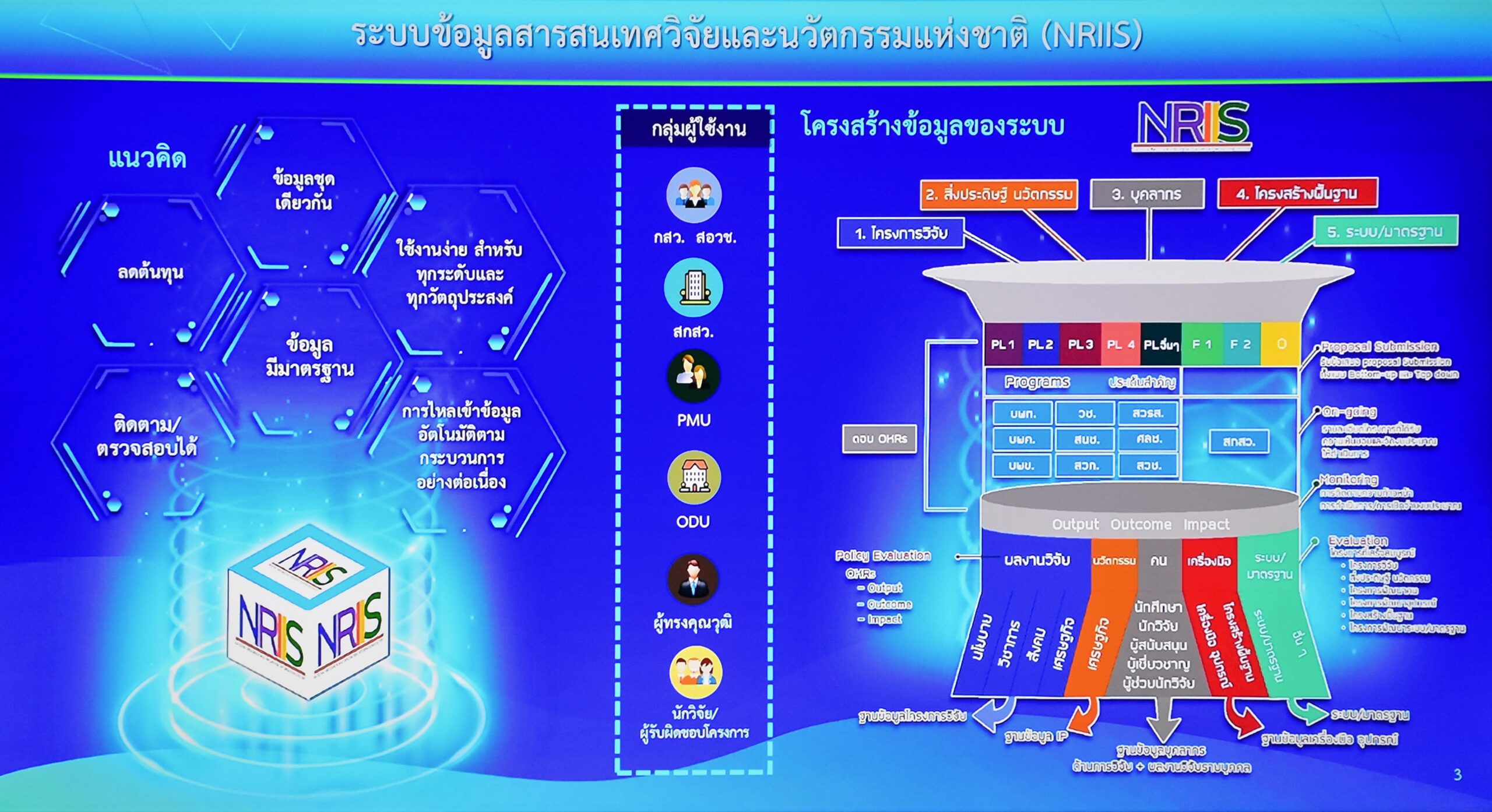 สำหรับระบบข้อมูลสารสนเทศวิจัยและนวัตกรรมแห่งชาติ (National Research and Innovation Information System : NRIIS) เกิดจากความร่วมมือ 3 ฝ่าย ได้แก่ สำนักงานคณะกรรมการส่งเสริมวิทยาศาสตร์ วิจัยและนวัตกรรม (สกสว.) สำนักงานสภานโยบายการอุดมศึกษา วิทยาศาสตร์วิจัยและนวัตกรรมแห่งชาติ (สอวช.) และสำนักงานการวิจัยแห่งชาติ (วช.) ซึ่งระบบ NRIIS มีระบบงานหลัก ประกอบด้วย ระบบสำหรับหน่วยงานกำหนดนโยบาย ระบบบริหารจัดการงบประมาณและแผนงาน ระบบบริหารจัดการโครงการสำหรับหน่วยบริหารจัดการ(ProgramManagement Unit : PMU) ระบบบริหารจัดการโครงการสำหรับหน่วยงานหรือมหาวิทยาลัย ซึ่งเป็นหน่วยงานบริหารจัดการและส่งมอบผลลัพธ์ (Outcome Delivery Unit : ODU) โดยระบบ NRIIS จะสนับสนุนระบบบริหารจัดการโครงการสำหรับนักวิจัย ระบบประเมินสำหรับผู้ทรงคุณวุฒิ ระบบข้อมูลบุคลากรวิจัยและนวัตกรรมระบบเชื่อมโยงข้อมูล ระบบบริการข้อมูล และระบบสนับสนุนการดำเนินงาน ตลอดจนบริหารจัดการและบำรุงรักษาระบบเพื่อสามารถให้บริการตามความต้องการใช้งานของผู้ใช้ระบบแต่ละกลุ่มเป้าหมายได้อย่างต่อเนื่องและมีประสิทธิภาพ![]()