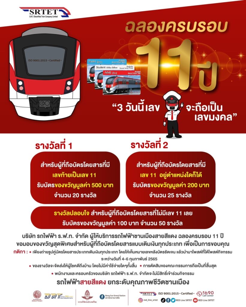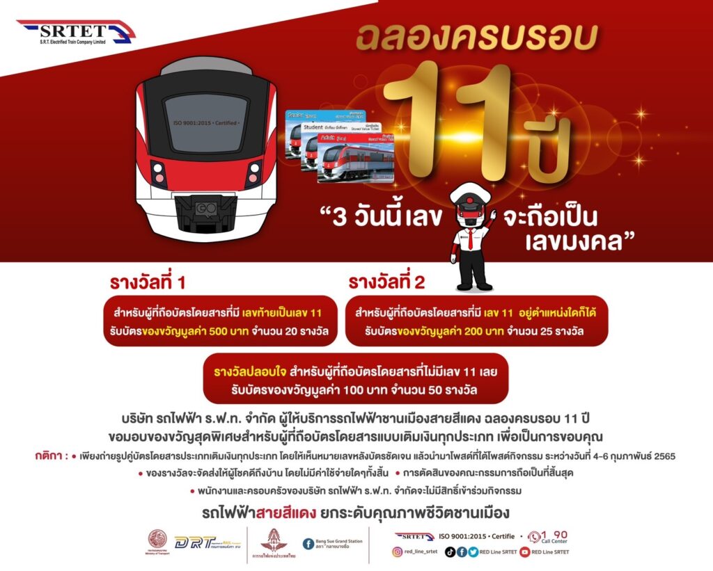 นอกจากนี้เนื่องในโอกาสสุดพิเศษครบรอบปีที่ 11 นี้ เพื่อเป็นการแสดงความขอบคุณผู้โดยสารที่ให้การสนับสนุนบริษัทมาโดยตลอด บริษัทจึงได้จัดกิจกรรมส่งเสริมการตลาดออนไลน์ เพื่อให้ผู้โดยสารที่ถือบัตรโดยสารทุกประเภทได้ร่วมกิจกรรมแบบ New Normal ลุ้น สนุก ปลอดภัย ได้รางวัล เพียงผู้โดยสารโพสต์ภาพถ่ายตัวท่านคู่กับบัตรโดยสารรถไฟฟ้าสายสีแดงของท่านที่แสดงหมายเลขหลังบัตรโดยสารอย่างชัดเจนในโพสต์กิจกรรมทาง Facebook RED Line SRTET ลุ้นรับรางวัลต่างๆดังนี้