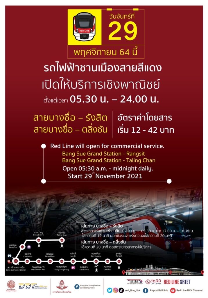 บริษัท รถไฟฟ้า ร.ฟ.ท. จำกัด เตรียมเปิดให้บริการเชิงพาณิชย์รถไฟฟ้าชานเมืองสายสีแดงวันที่ 29 พฤศจิกายน 2564