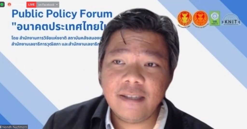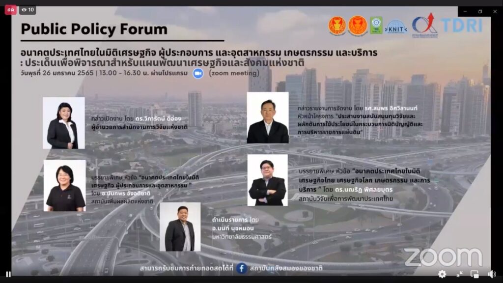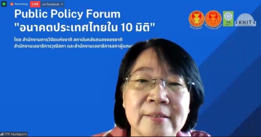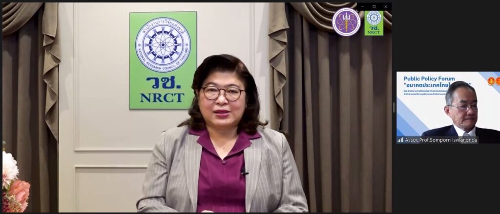 ดร.วิภารัตน์ ดีอ่อง ผู้อำนวยการสำนักงานการวิจัยแห่งชาติ (วช.) กระทรวงการอุดมศึกษา วิทยาศาสตร์ วิจัยและนวัตกรรม ได้ร่วมประชุมร่วมประชุม Public Policy Forum ประเด็น “อนาคตประเทศไทยใน 10 มิติ” ในหัวข้อ “อนาคตประเทศไทยในมิติเศรษฐกิจ ผู้ประกอบการ และอุตสาหกรรม เกษตรกรรม และบริการ:ประเด็นเพื่อพิจารณาสำหรับแผนพัฒนาเศรษฐกิจและสังคมแห่งชาติ” ครั้งที่ 4 ซึ่งประเด็นดังกล่าวเป็น 1 ในมิติสำคัญภายใต้โครงการประเทศไทยในอนาคต หรือ Future Thailand ซึ่งประกอบด้วยโครงการวิจัยย่อยทั้ง 10 มิติที่วช.ได้ให้ทุนสนับสนุนการวิจัยเชิงนโยบายแก่สถาบันคลังสมองของชาติเพื่อขับเคลื่อนให้ผลงานวิจัยถูกนำไปใช้ประโยชน์เป็นข้อมูลเชิงนโยบายประกอบการพิจารณาจัดทำร่างแผนพัฒนาเศรษฐกิจและสังคมแห่งชาติ ฉบับที่ 13
