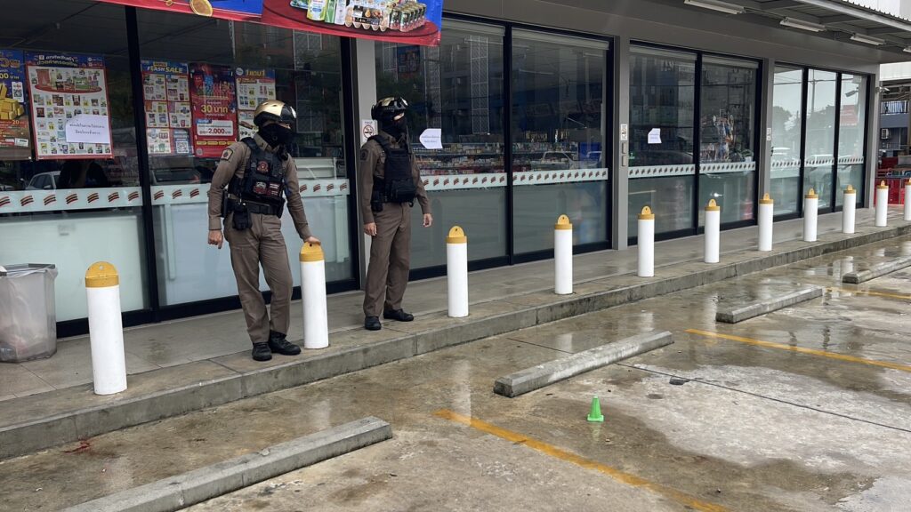 เมื่อไปถึงไหนที่เกิดเหตุพบว่าที่บริเวณลานจอดรถหน้าเซเว่นดังกล่าว พบ ส.ต.อ อัศนัย เรืองสาย อายุ 28 ปี ผบ.หมู่งานสืบสวน ถูกยิงเข้าบริเวณที่หว่างขาและแขน ส่วนอีกคนเป็น ตร.อาสา ชื่อนายอภิชัย ชื่นใจ อายุ 42 ปี ถูกยิงเข้าที่ขาถากลูกอัณฑะ เจ้าหน้าที่กู้ภัยฯ จึงทำการปฐมพยาบาลเบื้องต้น ก่อนรีบนำคนเจ็บส่งโรงพยาบาลกรุงสยามเซนต์คาร์ลอส ทันที นอกจากนี้ในที่เกิดเหตุ ยังพบปลอกกระสุน ขนาด 9 มม.ตกอยู่อีกจำนวนมาก พร้อมกับหัวกระสุน ที่ลานจอดรถ นอกจากนี้ ที่กระจกหน้าเซเว่นฯ ยังพบว่าถูกกระสุนแตกร้าวเป็นรูโหว่และที่คานเสาใกล้ปลั๊กไฟมีร่องรอยรูกระสุน