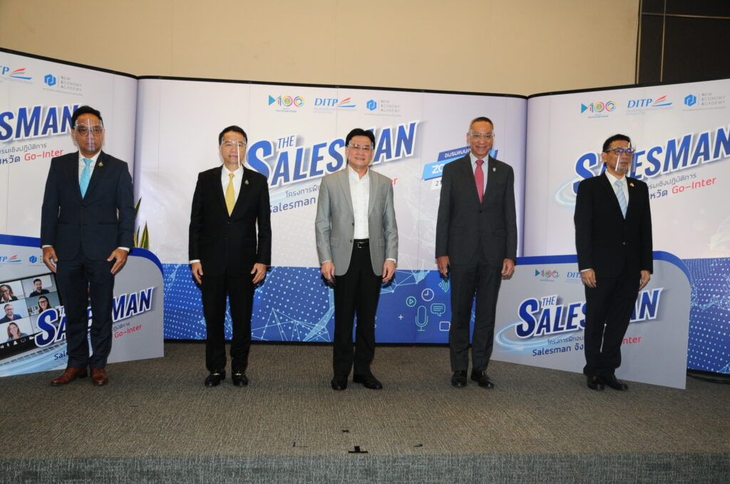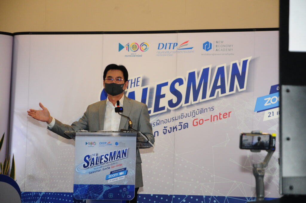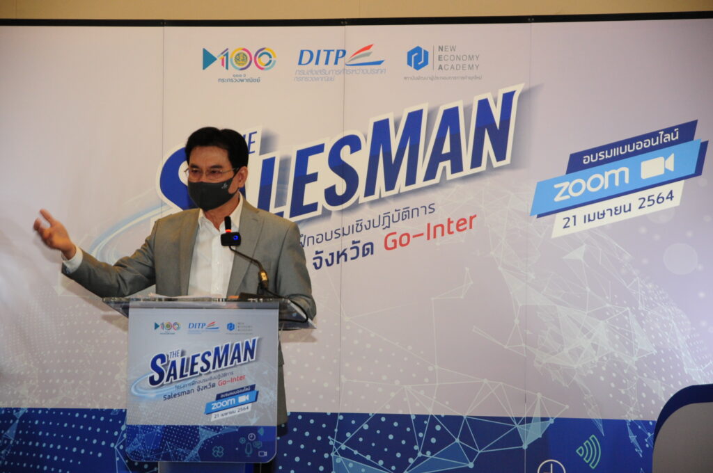 ประธานมอบนโยบายให้กับทีม Salesman จังหวัดในรูปแบบ ออนไลน์ผ่านระบบ Webinar ภายใต้โครงการฝึกอบรมเชิง ปฏิบัติการ Salesman จังหวัด Go-inter ณ สถาบันพัฒนา ผู้ประกอบการการค้ายุคใหม่ กรมส่งเสริมการค้าระหว่าง ประเทศ (ถนนรัชดาภิเษก) กรุงเทพฯ