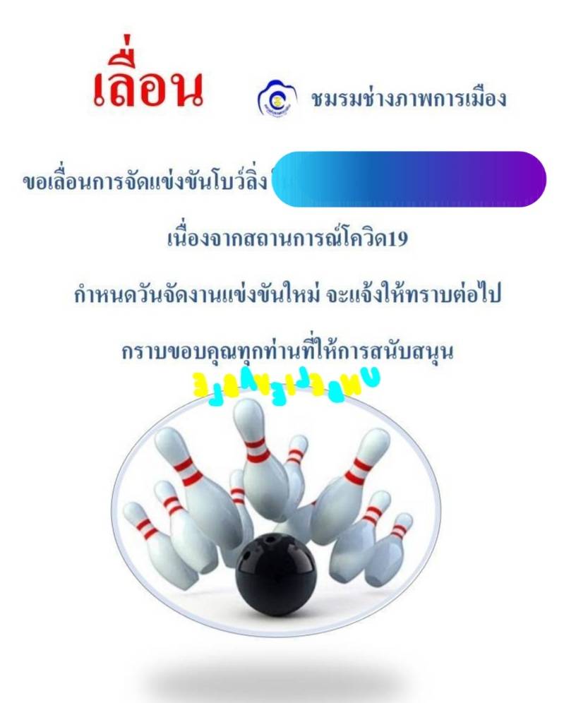 เลื่อนการแข่งขันโบว์ลิ่ง เนื่องจากสถานการณ์การแพร่เชื้อโควิค 19 อย่างต่อเนื่อง ในประเทศ จึงขอกำหนดวันแข่งขันใหม่ จะแจ้งให้ทราบอีกครั้ง ประธานชมรมช่างภาพการเมือง