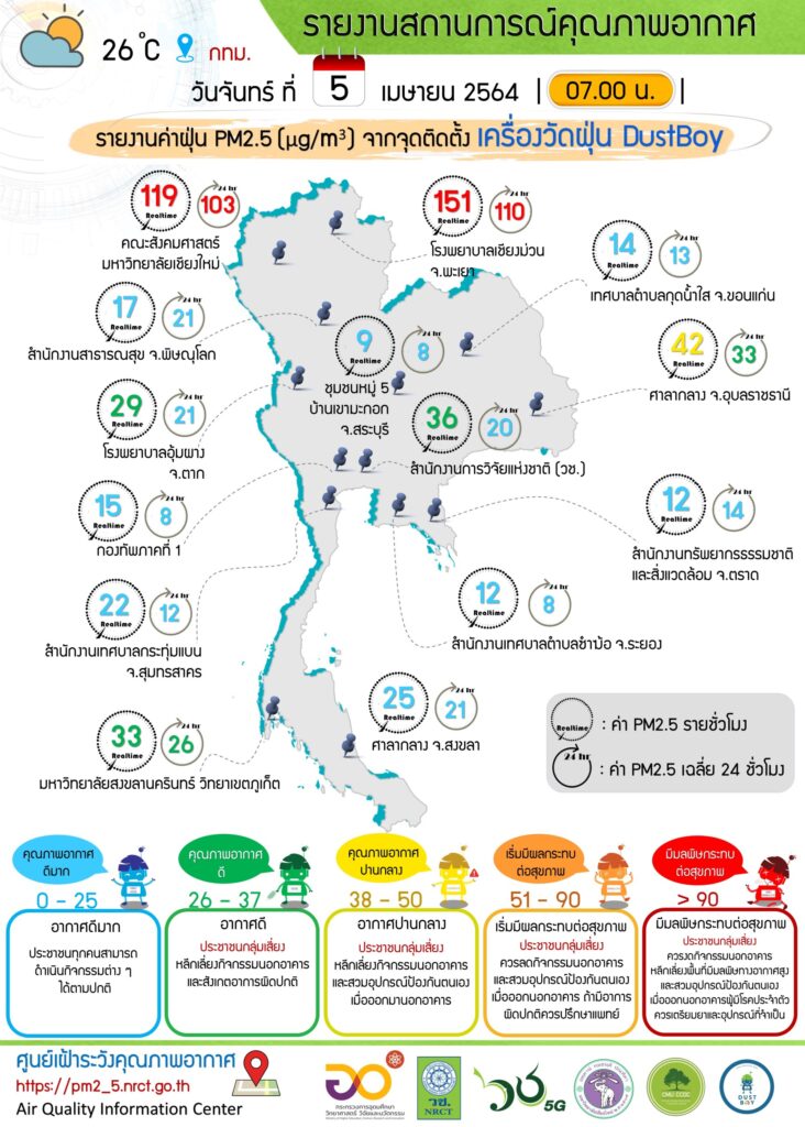 รายงานข้อมูลสถานการณ์คุณภาพอากาศ ณ วันจันทร์ที่ 5 เมษายน 2564