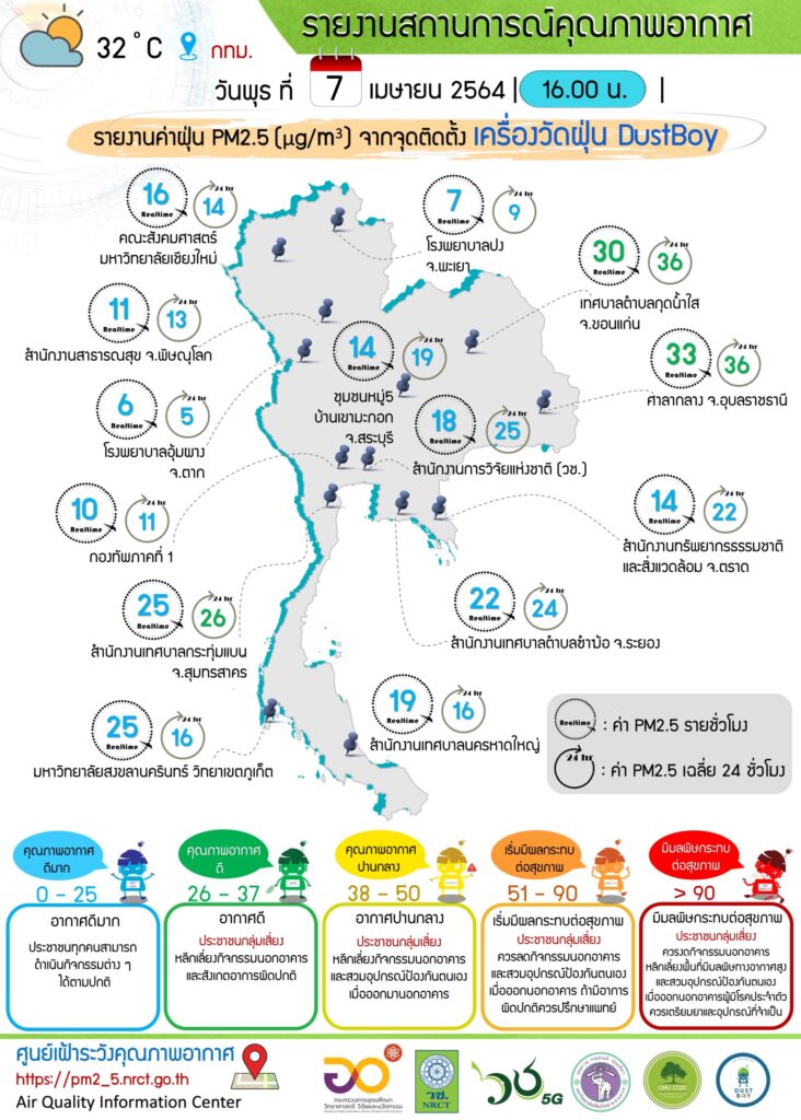 ณ เวลา 16.00 น. คุณภาพอากาศโดยรวมของพื้นที่กรุงเทพฯ มีค่าฝุ่นละอองขนาดเล็ก PM2.5 อยู่ในระดับดี แต่อย่าลืมสวมอุปกรณ์ป้องกันตัวเอง