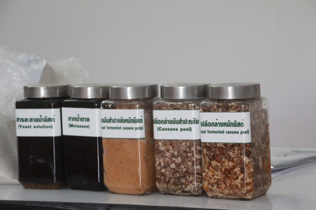 โดยพัฒนาให้สัตว์ได้รับโภชนะทางอาหารจากยีสต์ โดยใช้กากมันสำปะหลังหรือเปลือกล้างของมันสำปะหลัง มาผ่านการหมักร่วมกับ น้ำตาลทรายแดง กากน้ำตาล ปุ๋ยยูเรีย ยีสต์ขนมปัง และน้ำ เพื่อใช้เป็นวัตถุดิบอาหารเสริม แทนข้าวโพด หรือรำข้าว ในการผลิตเป็นอาหารสัตว์ เนื่องจากกากมันสำปะหลังเป็นวัตถุดิบที่หาได้ง่ายในพื้นที่ เหลือทิ้งจากโรงงานผลิตแป้งมันสำปะหลัง และมีราคาที่ถูก ประมาณ 300-500 บาท /ตัน สามารถใช้เป็นวัตถุดิบได้ทุกชนิดของอาหารสัตว์ โดยวิธีการการนำมาใช้กับสัตว์ประเภทต่าง ๆ จะมีความแตกต่างกัน คือ กลุ่มสัตว์ใหญ่ ต้องใช้กากมันที่ผ่านการหมักตั้งแต่ 10 วันขึ้นไป – 90 วัน และกลุ่มสัตว์ปีกและสุกร จะใช้กากมันที่ผ่านการหมัก ตั้งแต่ 25 ขึ้นไป – 90 วัน โดยควรใช้กับสัตว์ระยะรุ่น ระยะขุน และระยะพ่อพันธุ์แม่พันธุ์ หากเสริมอาหารผสมเข้าไปร้อยละ 30 ก็จะสามารถช่วยลดต้นทุนการเลี้ยงสัตว์ได้มาก เฉลี่ย 15.2 บาท/กก. เมื่อเทียบกับต้นทุนอาหารแบบสำเร็จรูป