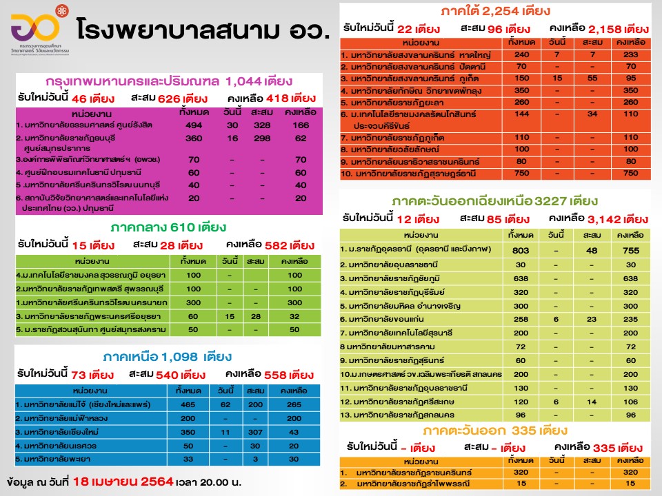 จากข้อมูลของโรงพยาบาลสนาม อว. เป็นส่วนแต่ละมหาวิทยาลัย และสถาบันการศึกษาภายใต้สังกัด อว. พบว่า