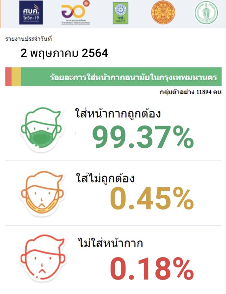 ศ.ดร.ธนารักษ์ ธีระมั่นคง สถาบันเทคโนโลยีนานาชาติสิรินธร (SIIT) มหาวิทยาลัยธรรมศาสตร์ รายงานว่า “ข้อมูลเล่าสุดได้ประเมินแบบอัตโนมัติในประชากร 11,894 คน เมื่อวันที่ 30 เมษายน 2564 จาก 30 จุด ใน 28 เขตทั่วกรุงเทพมหานคร โดยทุกจุดมีผู้ใส่หน้ากากอนามัยมากกว่า 95% และมี 8 จุดในเขตยานนาวา มีนบุรี ภาษีเจริญ พระนคร บางคอแหลม ดอนเมือง จตุจักร และคลองเตย ประชาชนที่สัญจรไปมาได้ใส่หน้ากากอนามัย 100% แล้ว”