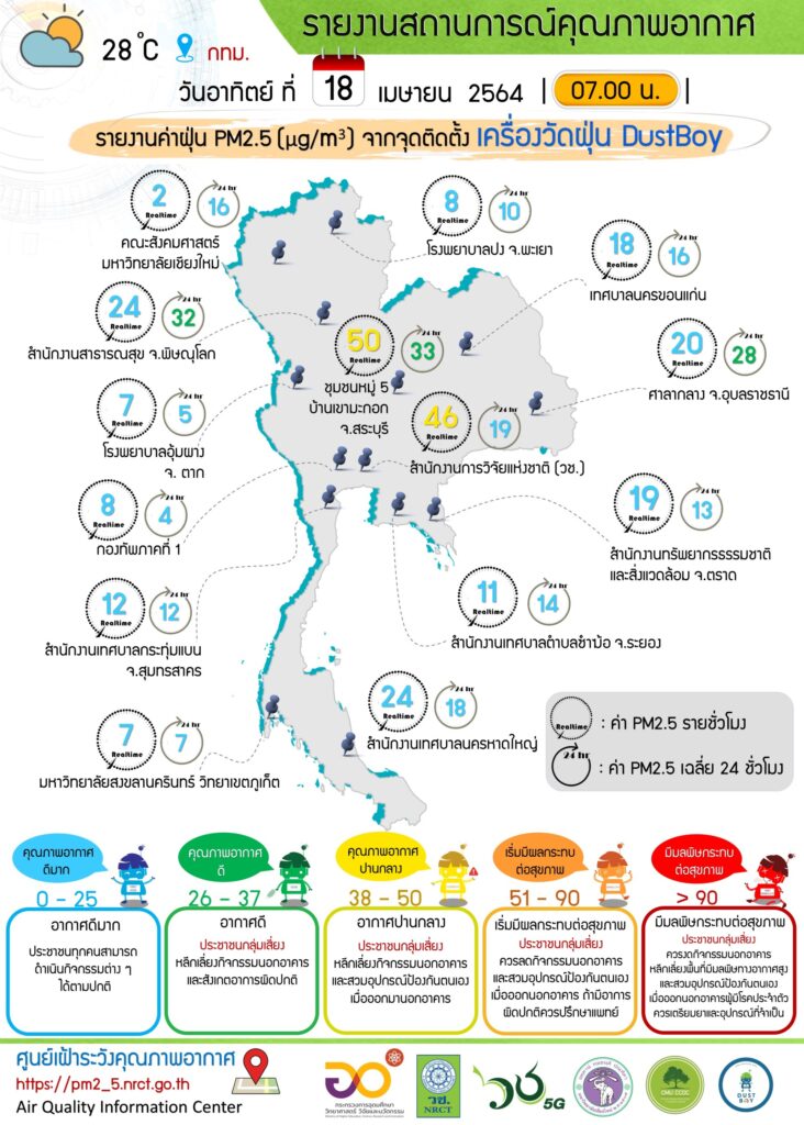 อากาศโดยรวมของพื้นที่กรุงเทพฯ มีค่าฝุ่นละอองขนาดเล็ก PM2.5 ณ เวลา 7.00 น. อยู่ระหว่าง 2 – 51 ug/m3