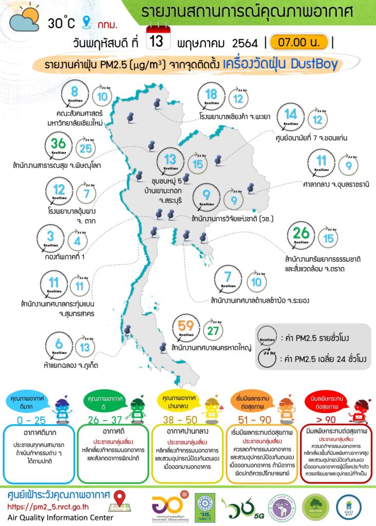 ท่องเที่ยวไทย » รายงานข้อมูลสถานการณ์คุณภาพอากาศ ณ วันพฤหัสบดี ที่ 13 พฤษภาคม 2564