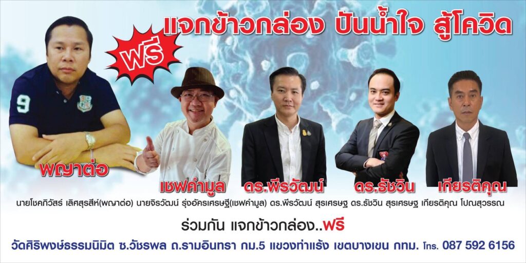 • และยังมีผู้ติดเชื้ออยู่จำนวนมาก ส่งผลกระทบต่อทุกภาคส่วนธุรกิจและปัญหาการดำเนินชีวิตในกลุ่มของ”พญาต่อ” จึงได้มาร่วมกันแจกข้าวกล่องที่วัดศิริพงษ์ธรรมนิมิต ซอยวัชรพล แขวงท่าแร้ง เขตบางเขน กทม.ตั้งแต่เวลา 11 โมงเป็นต้นไป โดยมีเงื่อนไข ประชาชนคนทั่วไปสามารถมารับข้าวกล่องได้หนึ่งคนต่อหนึ่งกล่อง