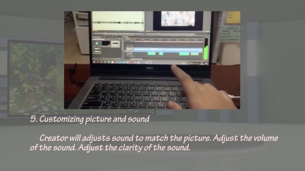 ผู้พิการทางสายตาให้สามารถเข้าใจเนื้อหาของสื่อที่ต้องการับชมได้มากยิ่งขึ้น ลักษณะของเสียงบรรยายภาพ คือการบรรยายด้วยเสียงในช่วงที่ไม่มีการพูดคุย ไม่มีการสนทนา ซึ่งเป็นช่องว่างของวีดีโอนั้น ๆ ผู้พิการทางสายตาจะไม่สามารถรับรู้ได้ว่าในระหว่างนั้นเกิดเหตุการณ์อะไรบ้าง เสียงบรรยายภาพจะมีหน้าที่ทำให้ผู้พิการทางสายตารับรู้ว่าเหตุการณ์ในฉากนั้นดำเนินไปอย่างไรตัวละครกำลังทำอะไร ทำให้ผู้พิการทางสายตาเข้าใจในเนื้อหาสาระของเรื่องการศึกษาจะเริ่มจากการนำคลิปวีดิโอหนังสั้น มาตรวจดูเพื่อหาช่องว่างระหว่างบทสนทนาของตัวละครหรือเสียงบรรยาย เพื่อให้ได้ระยะเวลาของช่องว่างที่จะสามารถใส่เสียงบรรยายภาพลงไปได้ ต่อมาซึ่งมีการเขียนบทเสียงบรรยายภาพ เมื่อได้บทเสียงบรรยายภาพเรียบร้อยแล้ว จึงทดลองลงเสียงและอาจมีการปรับการใช้คำหรือประโยคให้พอดีกับช่องว่างของเวลา ซึ่งเป็นขั้นตอนที่ต้องมีการพิจารณาการใช้คำที่เหมาะสม และผู้พิการทางสายตาสามารถที่จะเข้าใจได้ รวมถึงการใช้ประโยคที่มีความพอดีกับช่องว่างของเวลา ให้ได้ประโยคที่มีความหลากหลายและผู้ฟังเข้าใจ หลังจากนั้นทำการบันทึกเสียง และเข้าสู่โปรแกรมตัดต่อเพื่อให้ภาพและเสียงบรรยายให้มีความสัมพันธ์กัน และทำการตรวจสอบความเรียบร้อยอีกครั้งจนเป็นผลงานที่เสร็จสมบูรณ์