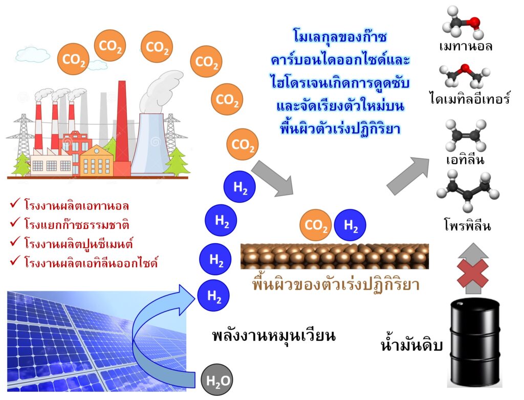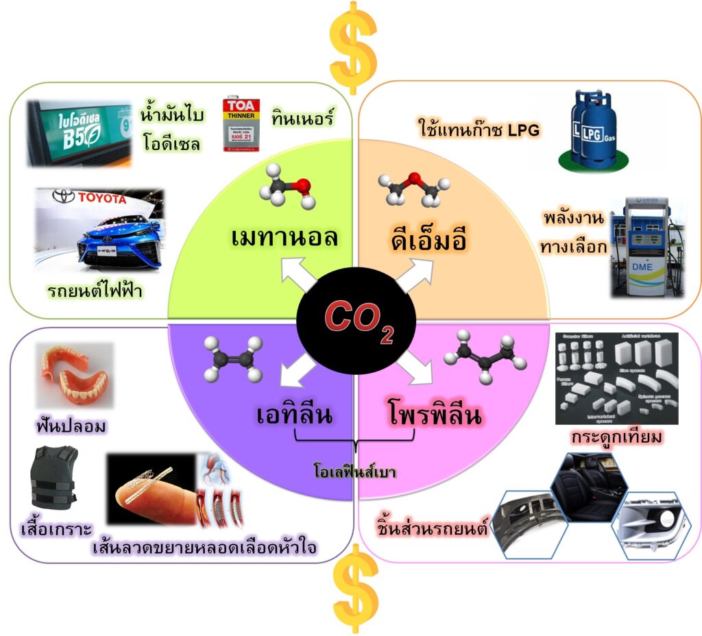 เมทานอล ไดเมทิลอีเทอร์ และโอเลฟินส์ แทนกระบวนการดักจับและกักเก็บก๊าซ CO2 ที่มีต้นทุนสูง โดยเฉพาะการพัฒนาตัวเร่งปฏิกิริยาโลหะออกไซด์ผสม สำหรับเปลี่ยนก๊าซ CO2 ให้เป็นโอเลฟินส์ที่สามารถต่อยอดและเพิ่มมูลค่าเป็นผลิตภัณฑ์ต่างๆ ได้อย่างหลากหลาย โอเลฟินส์ ได้แก่ เอทิลีนและโพรพิลีน เป็นวัตถุดิบตั้งต้นสำคัญในการผลิตเม็ดพลาสติกจำพวกพอลิเอทิลีนและ