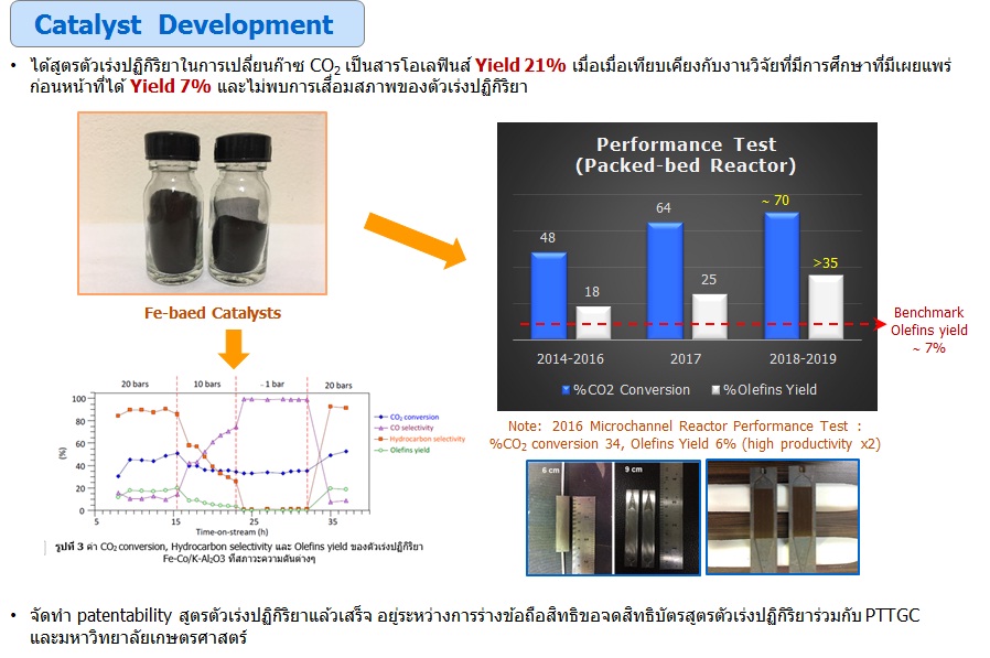 เนื่องจากก๊าซ CO2 เป็นโมเลกุลที่มีความเสถียร ดังนั้นจึงจำเป็นต้องใช้ตัวเร่งปฏิกิริยาที่มีประสิทธิภาพสูง เพื่อเปลี่ยนก๊าซ CO2 ให้เป็นโอเลฟินส์ได้อย่างจำเพาะเจาะจง และได้ร้อยละผลได้ของโอเลฟินส์สูงคุ้มค่าต่อการผลิตในระดับอุตสาหกรรม หัวใจหลักสำคัญของการออกแบบตัวเร่งปฏิกิริยาที่ใช้สำหรับเปลี่ยนก๊าซ CO2 ให้เป็นโอเลฟินส์ คือการควบคุมความสามารถในการเติมไฮโดรเจนบนอะตอมคาร์บอนของตัวเร่งปฏิกิริยาไม่ให้สูงเกินไป เพื่อช่วยลดการเกิดผลิตภัณฑ์กลุ่มพาราฟินส์หรือไฮโดรคาร์บอนพันธะเดี่ยวซึ่งเป็นผลิตภัณฑ์ที่ไม่ต้องการ โดยองค์ประกอบหลักของตัวเร่งปฏิกิริยาต้องประกอบด้วยธาตุหมู่ทรานซิชันและโลหะอัลคาไลน์ซึ่งมีคุณสมบัติโดดเด่นในการลดปฏิกิริยาการเติมไฮโดรเจนดังกล่าว จากการศึกษาความสัมพันธ์ระหว่างโครงสร้างของตัวเร่งปฏิกิริยาด้วยเทคนิคขั้นสูงกับประสิทธิภาพในการเปลี่ยนก๊าซ CO2 เป็นโอเลฟินส์ ทำให้ผู้วิจัยสามารถพัฒนาตัวเร่งปฏิกิริยาที่ให้ร้อยละผลได้ของโอเลฟินส์สูงถึง 21 ซึ่งเป็นค่าที่สูงที่สุดเท่าที่เคยมีการรายงานมา ปัจจุบันคณะผู้วิจัยยังคงพัฒนาตัวเร่งปฏิกิริยาที่มีประสิทธิภาพสำหรับเปลี่ยนก๊าซ CO2 ให้เป็นโอเลฟินส์อย่างต่อเนื่อง โดยมีเป้าหมายที่จะเพิ่มผลผลิตโอเลฟินส์ให้สูงขึ้นกว่าเดิม และมุ่งหวังว่าองค์ความรู้ที่ได้จะถูกถ่ายทอด และนำไปใช้ประโยชน์อย่างเป็นรูปธรรม เกิดโรงงานผลิตโอเลฟินส์จากก๊าซ CO2 ที่มีเทคโนโลยีการผลิตเป็นของตนเอง สร้างงาน สร้างรายได้ให้กับประชากร เพิ่มสภาพคล่องทางเศรษฐกิจให้กับประเทศ และแก้ไขปัญหาด้านสิ่งแวดล้อมของโลกไปพร้อมกัน