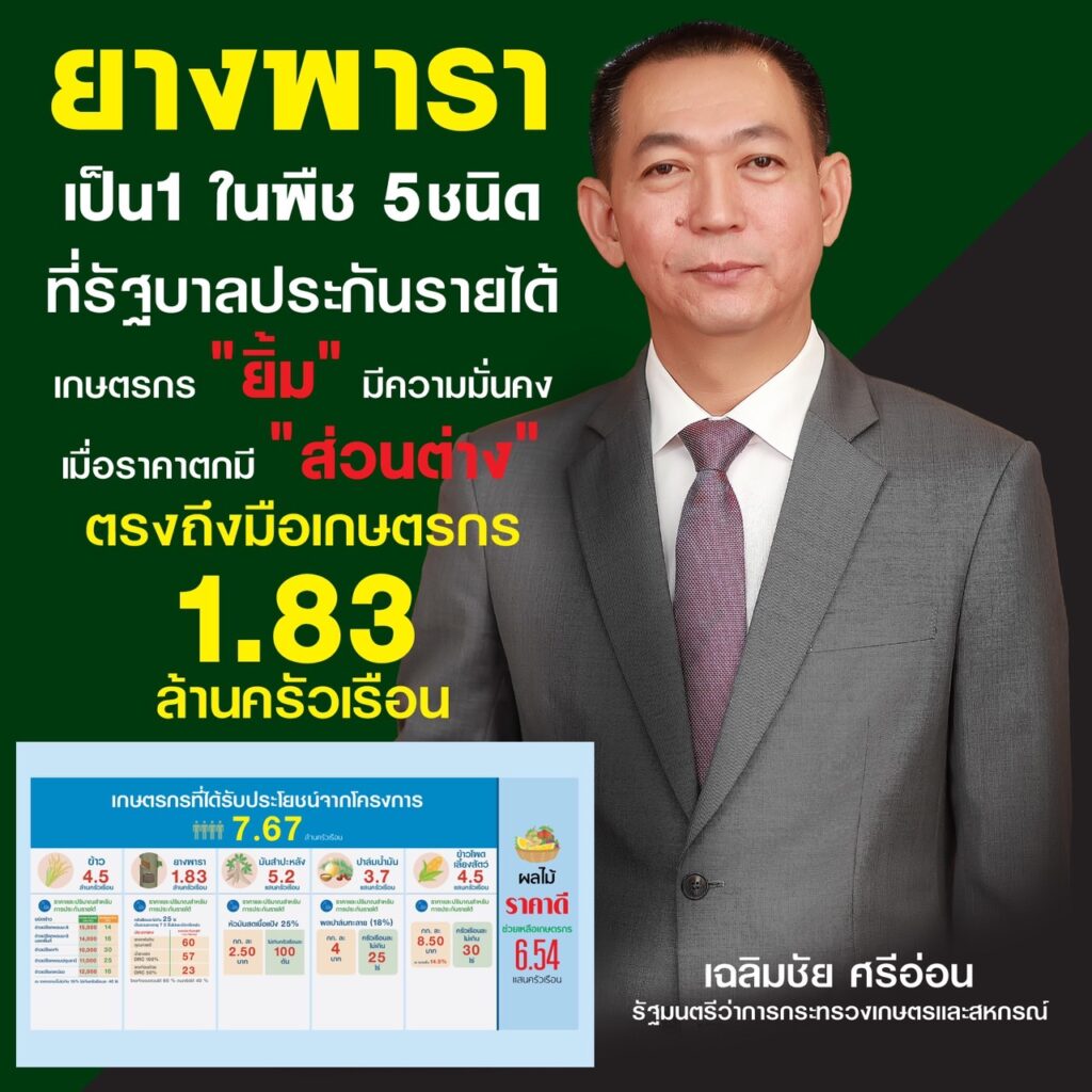 นายเฉลิมชัย กล่าวว่า ตนเข้ามารับตำแหน่งรัฐมนตรีเมื่อวันเดือนกรกฎาคมปี 2562 และรัฐบาลแถลงนโยบายประกันรายได้ราคาพืชผลการเกษตร 5 ชนิด ยางพาราเป็น 1 ในสินค้า 5 ชนิด ที่รัฐบาลดำเนินโครงการประกันรายได้ เพื่อให้พี่น้องประชาชนได้รับการประกันว่าจะมีการรายได้ขั้นต่ำที่สามารถดำรงชีวิตอยู่ได้ เพราะพี่น้องคนไทยส่วนใหญ่ประกอบอาชีพเกษตรกรรม ถ้าเกษตรกรมีความเข้มแข็งประเทศชาติก็มีความเข้มแข็งด้วย ถ้ามีรายได้ที่มั่นคงประเทศชาติก็จะมั่นคงด้วย