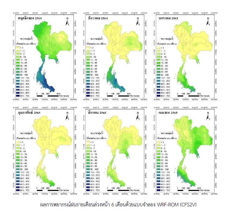 บริเวณสถานีตรวจวัดน้ำท่า C.2 โดยใช้แบบจำลองน้ำฝน-น้ำท่าและการบริหารจัดการน้ำ ร่วมกับผลการพยากรณ์ฝนล่วงหน้า 6 เดือนด้วยแบบจำลอง WRF-ROM (CFS2V) ตั้งแต่เดือน พ.ย. 2564-เม.ย. 2565 พบว่า ปริมาณฝนสะสมในช่วงระยะเวลาดังกล่าวมีค่าประมาณ 5-30 มม.เท่านั้น นอกจากนี้พบว่า ปริมาณน้ำท่าตามธรรมชาติที่คาดการณ์ว่าจะเกิดขึ้นบริเวณสถานีตรวจวัดน้ำท่า C.2 ในช่วงเดือน ธ.ค. 2564-เม.ย. 2565 มีปริมาณเพียง 610 ล้านลูกบาศก์เมตร คิดเป็น 11 เปอร์เซ็นต์ของปริมาณความต้องการน้ำตามแผนการจัดสรรน้ำในฤดูแล้ง โดยการบริหารจัดการน้ำในลุ่มน้ำเจ้าพระยาในช่วงระยะเวลาดังกล่าว จะต้องอาศัยปริมาณน้ำต้นทุนจาก 4 เขื่อนข้างต้นเป็นหลัก และต้องควบคุมการใช้น้ำให้เป็นไปตามแผนการจัดสรรน้ำ เพื่อไม่ให้เกิดปัญหาการขาดแคลน โดยเฉพาะอย่างยิ่งสำหรับใช้ในการปลูกข้าวนาปรังช่วงฤดูแล้ง และช่วงต้นฤดูฝน (เดือน พ.ค. 65-ก.ค. 65) ตามที่กรมชลประทานได้คาดการณ์พื้นที่เพาะปลูกข้าวนาปรังในลุ่มน้ำเจ้าพระยาตามแผนการจัดสรรน้ำ จำนวน 2.8 ล้านไร่ ซึ่งมีปริมาณการใช้น้ำประมาณ 1,970 ล้านลูกบาศก์เมตร หรือคิดเป็น 35 เปอร์เซ็นต์ของการใช้น้ำทั้งหมด เห็นได้ว่า ปริมาณน้ำต้นทุนยังมีอย่างจำกัด