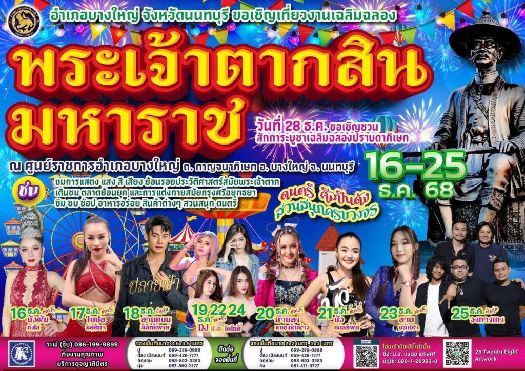 ส่วนในวันที่ 28 ธันวาคม เชิญชวนร่วมสักการะบูชาเฉลิมฉลองปราบดาภิเษก ณศูนย์ราชการอำเภอบางใหญ่ถนนกาญจนาภิเษกอำเภอบางใหญ่จังหวัดนนทบุรี ชมการแสดงแสงสีเสียงย้อนรอยประวัติศาสตร์สมัยพระเจ้าตาก เดินชมตลาดย้อนยุคและการแต่งกายสมัยกรุงศรีอยุธยา
