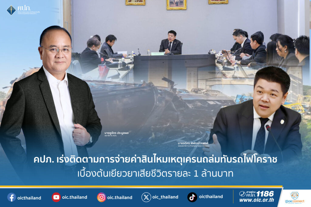 โดยมอบหมายให้นายอดิศร พิพัฒน์วรพงศ์ รองเลขาธิการ ด้านกฎหมายและตรวจสอบ เป็นประธานการประชุมหารือแนวทางการชดใช้ค่าสินไหมทดแทนจากเหตุดังกล่าว พร้อมเชิญบริษัทประกันภัยที่เกี่ยวข้องเข้าร่วมประชุม ซึ่งมีบริษัท ทิพยประกันภัย จำกัด (มหาชน) เป็นผู้รับประกันภัยหลักในสัดส่วน 60% รวมถึงมี นายอนันต์ เจตงามกุล รองผู้ว่าการรถไฟแห่งประเทศไทย เข้าร่วมประชุมเพื่อประสานข้อมูลและแนวทางการดำเนินการร่วมกัน ณ ห้องประชุม 201 ชั้น 2 สำนักงาน คปภ. ถนนรัชดาภิเษก กรุงเทพมหานคร