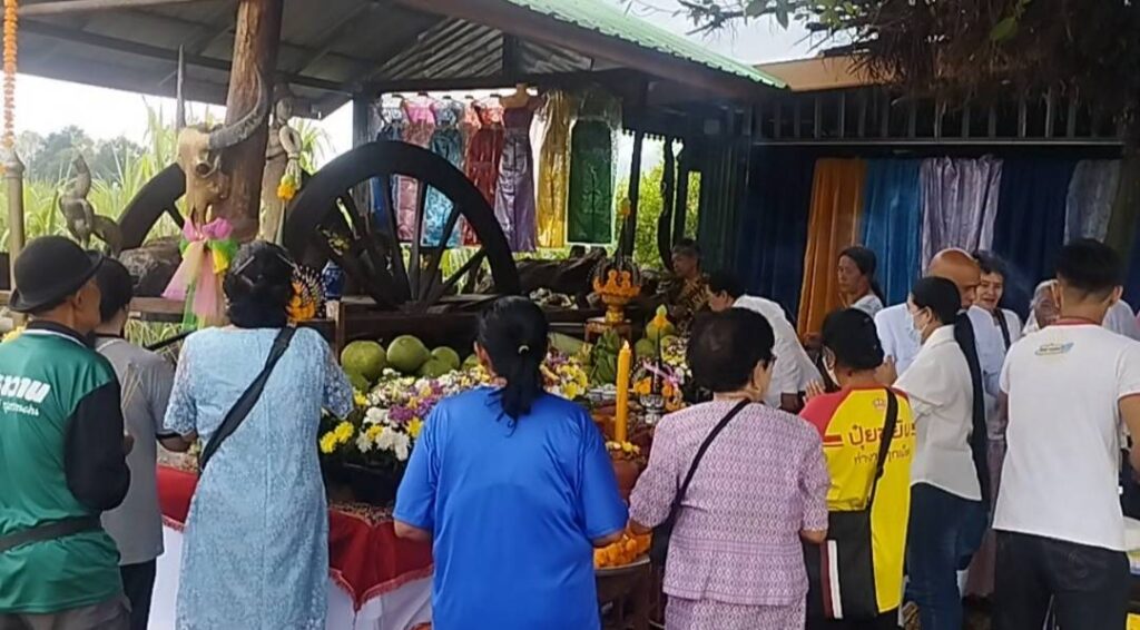 เมื่อวันที่ 31 ต.ค.2568 ผู้สื่อข่าวรายงานว่า ที่บ้านเลขที่ 204/7 หมู่ 5 บ้านเพชรเจริญ ต.ระบำ อ.ลานสัก จ.อุทัยธานี ได้พบกับนายสุนทร อายุ 54 ปี พร้อมกับชาวบ้านในพื้นที่และนอกพื้นที่ เดินทางมาร่วมงานรำถวายกราบไหว้ขอโชคลาภกับเจ้าแม่รถเกวียนตะเคียนทอง อายุเก่าแก่เนื่องจากงวดที่แล้วให้โชคเจ้าของบ้านถูกนับแสนบาท