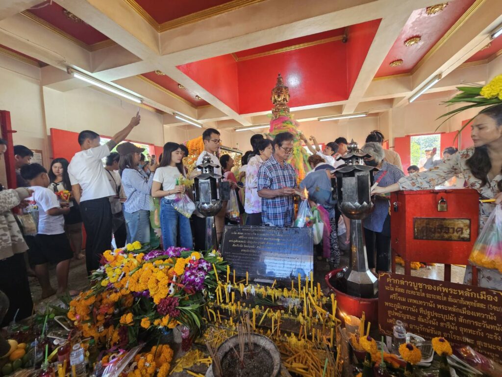 และ ปิดทองเสาพระหลักเมือง จากนั้นแตะฐานเสาหลักเมืองขอสุขภาพและชีวิตมั่นคง หรือพบบางคนแตะลำเสาขอความรักและครอบครัว หรือ แตะเหนือมือขอการงานการเงิน แต่ที่ขาดไม่ได้คือก่อนกลับคือการตีฆ้องชัยเพื่อให้เกิดชัยชนะ จากนั้นขากลับลงมาเสี่ยงดวงโชคลาภซื้อสลากกินแบ่งรัฐบาลที่มีมาจำหน่ายถึงที่รวม 3 แผงลุ้นรวยเป็นเศรษฐีรับต้นปี 2569 นี้