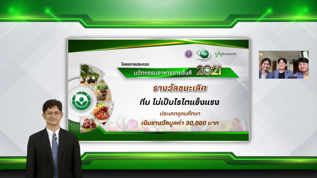 3. รางวัลรองชนะเลิศอันดับ 2 ได้รับเงินรางวัล 10,000 บาท พร้อมประกาศนียบัตร ได้แก่ ทีม Neo Tofu Technology มหาวิทยาลัยมหิดล ผลงาน เต้าหู้ดำฉายรังสีซอสแจ่วพร้อมบริโภค