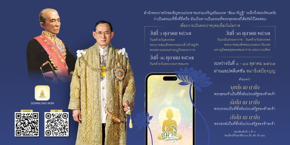 สำนักพระราชวัง ขอเชิญชวนประชาชนร่วมเจริญอริยมรรค “สัมมาทิฏฐิ” ระลึกถึงพระรัตนตรัย ด้วยบทว่า พุทโธ เม นาโถ (พระพุทธเจ้าเป็นที่พึ่งอันประเสริฐของข้าพเจ้า) ธัมโม เม นาโถ (พระธรรมเป็นที่พึ่งอันประเสริฐของข้าพเจ้า) สังโฆ เม นาโถ (พระสงฆ์เป็นที่พึ่งอันประเสริฐของข้าพเจ้า) (โดยให้ระลึกย้ำ ๆ ซ้ำ ๆ ต่อเนื่องได้ในทุกอิริยาบถ ยืน เดิน นั่ง นอน) เพื่อถวายเป็นพระราชกุศลเนื่องในโอกาสวันคล้ายวันสวรรคต พระบาทสมเด็จพระจอมเกล้าเจ้าอยู่หัว พระสยามเทวมหามกุฏวิทยมหาราช ในวันที่ 1 ตุลาคม 2567 และวันคล้ายวันพระบรมราชสมภพ ในวันที่ 18 ตุลาคม 2567 และเนื่องในวันนวมินทรมหาราช ซึ่งเป็นวันคล้ายวันสวรรคตพระบาทสมเด็จพระบรมชนกาธิเบศร มหาภูมิพลอดุลยเดชมหาราช บรมนาถบพิตร ในวันที่ 13 ตุลาคม 2567 ผ่านแอปพลิเคชัน “สมาธิเสบียงบุญ” บันทึกเวลาการทำสมาธิเจริญจิตตภาวนา ตั้งแต่วันที่ 1 ตุลาคม 2567 เวลา 08.00 น. ถึง วันที่ 18 ตุลาคม 2567 เวลา 08.00 น. ทั้งนี้ สามารถ ดาวน์โหลดแอปพลิเคชันได้ทั้ง Play Store และ App store