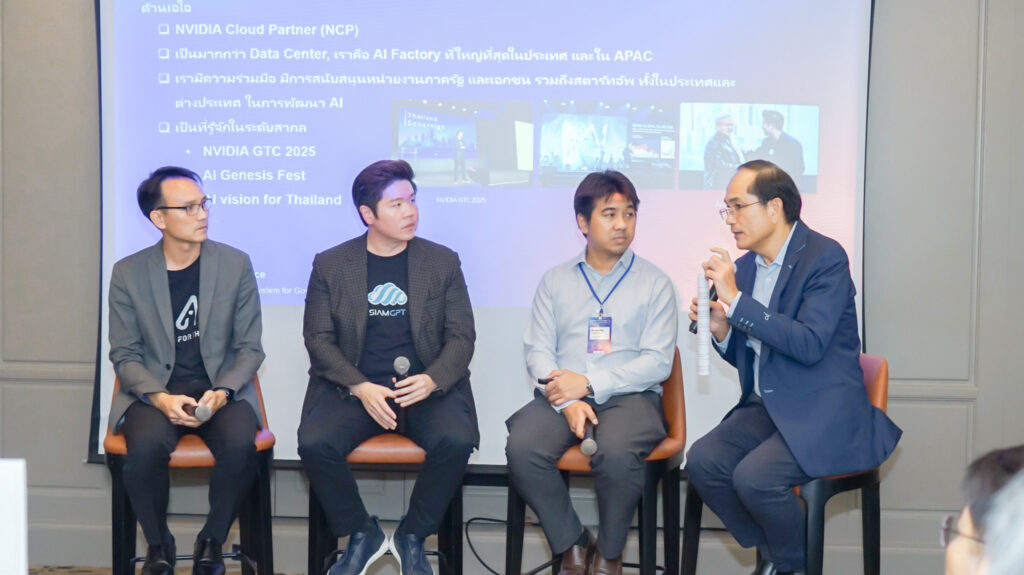 ปิดท้ายด้วยการเสวนา (Panel Discussion) ที่ผสานมุมมองจากผู้นำทั้งภาครัฐและเอกชน ได้แก่ ดร. ชัย วุฒิวิวัฒน์ชัย ผู้อำนวยการศูนย์เทคโนโลยีอิเล็กทรอนิกส์และคอมพิวเตอร์แห่งชาติ (NECTEC) , คุณรัตนพล วงศ์นภาจันทร์ ประธานกรรมการฝ่ายบริหาร บริษัท สยามเอไอ คอร์ปอเรชั่น จำกัด และ ดร. ธัชพล โปษยานนท์ Country Director Palo Alto Networks Thailand and Vietnam โดยหัวข้อการเสวนาครอบคลุมประเด็นสำคัญที่ส่งผลต่อการขับเคลื่อน AI ในประเทศไทย ไม่ว่าจะเป็นทิศทางของงานวิจัย AI ในช่วง 3–5 ปีข้างหน้า จุดแข็งของภาครัฐไทยในด้านโครงสร้างพื้นฐานและศักยภาพบุคลากร ความท้าทายของการพัฒนา Sovereign AI Cloud ควบคู่กับการรักษาความมั่นคงทางไซเบอร์ ตลอดจนแนวทางการกำกับดูแล AI ที่เหมาะสมในระดับประเทศ