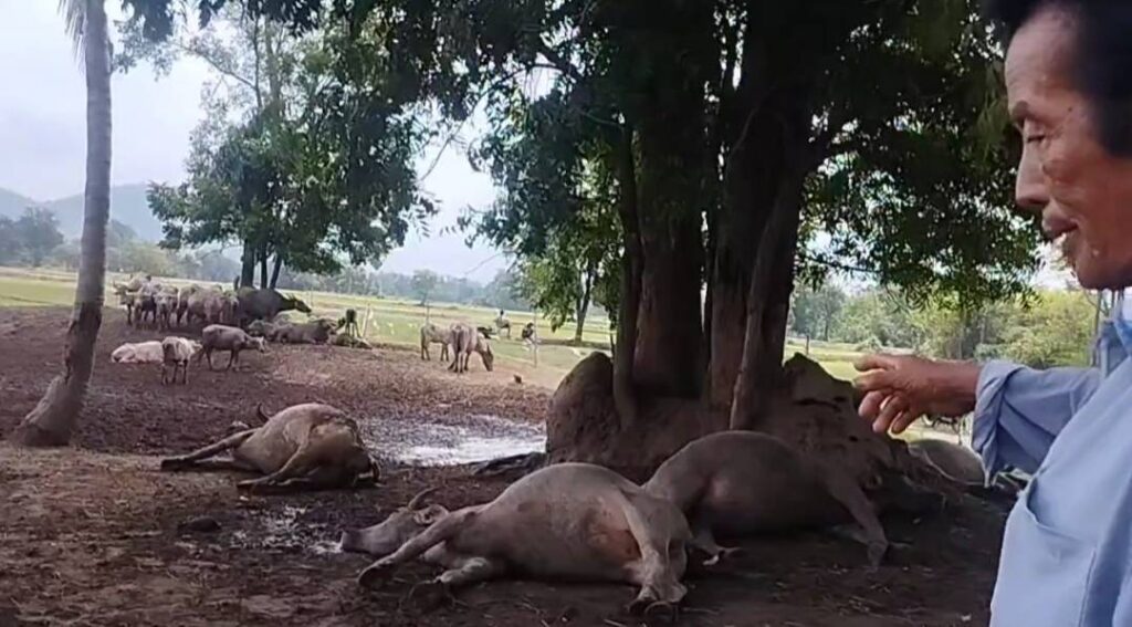 เมื่อเวลา 10:00 น ของวันที่ 17 พฤษภาคม 2568 ผู้สื่อข่าวรายงานที่บ้านเขาขี้ฝอยระหว่างเขตติดต่อหมู่6กับหมู่3 ต.ทุ่งนาไท อ.ทัพทัน จ.อุทัยธานี ได้พบกับเจ้าของควายชื่อนายปราโมทย์ สายเพ็ชร์ อายุ 78 ปี ได้เปิดเผยว่าตัวตาเองเลี้ยงควายทั้งหมด 26 ตัว เมื่อช่วงเช้าของวันนี้เวลาประมาณ 6 โมงเช้า ตัวตาเองได้เดินจากบ้านเพื่อจะมาปล่อยควายที่คอกควาย จังหวะนั้นมาเห็นควายนอนตาย 4 ตัว นอนตายอยู่ใต้ต้นไม้ใหญ่ เป็นตัวเมียทั้งหมด 4 ตัว อยู่ในสภาพตัวเกร็ง ท้องป่อง อุจจาระคาอยู่รูทวาร