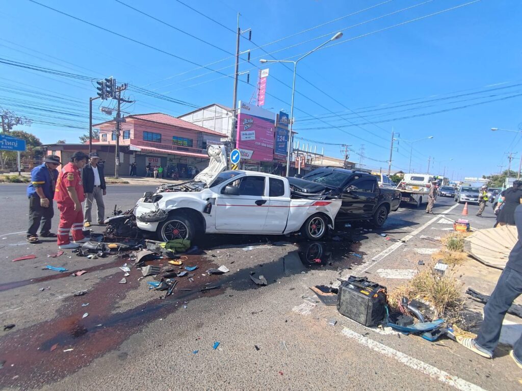 ประเดิมก่อนถึง 7 วันอันตราย ชนวินาศสันตะโรไฟแดง กระบะพุ่งชนอัดท้ายกระบะจอดติดสัญญาณกระเด็นไปเสยคันหน้ากระแทกอัดจยย. 2 คัน บาดเจ็บ 10 เสียชีวิต 1 ราย