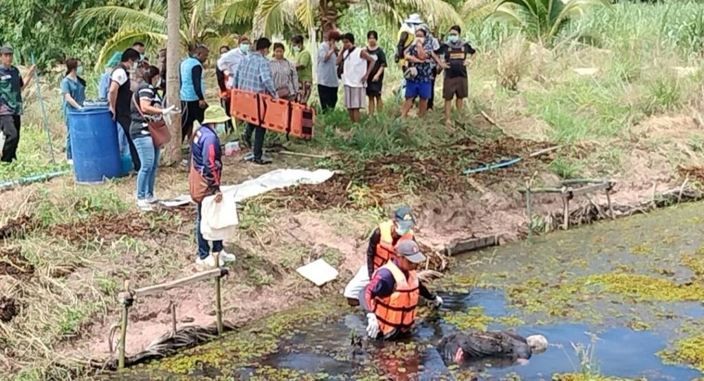 จากการสอบถามนายกมล อายุ 49 ปี เปิดเผยว่า ตนเองได้มาเช่าที่ของผู้ตาย เพื่อปลูกทำอาชีพไร่อ้อย และไปมาหาสู่พูดคุยกับผู้ตายอยู่บ่อยครั้ง เนื่องจากผู้ตายเป็นคนขยันและอยู่บ้านเพียงลำพัง จนมาล่าสุดช่วงสายๆของวันนี้ ตนเองไม่เห็นผู้ตายอยู่ที่บ้าน และคิดว่าผู้ตายน่าจะไปทำความสะอาดที่สระน้ำ เนื่องจากผู้ตายชอบไปเก็บแหนพืช เก็บดอกจอกออกจากสระ แทบผงะไปพบเห็นร่างผู้ตายลอยอยู่ในน้ำ จึงได้ประสานไปยังผู้ใหญ่บ้านในพื้นที่ และตำรวจมายังที่เกิดเหตุ