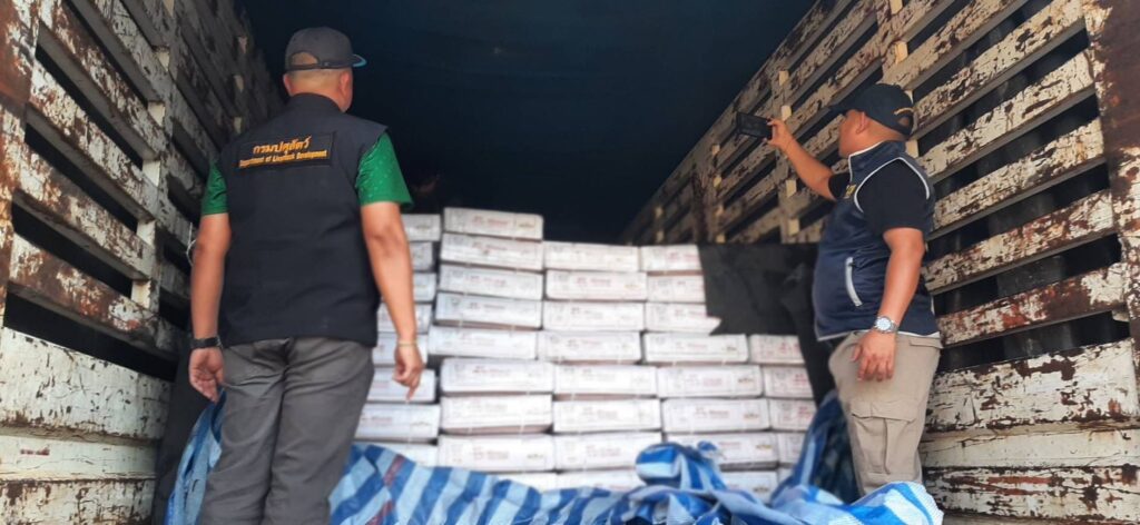 ซึ่งขณะเจ้าหน้าที่เข้าแสดงตัว รถบรรทุกทั้งสองคันกำลังเตรียมความพร้อมในการ นัดหมายเพื่อเปลี่ยนถ่ายเนื้อเถื่อน ไปยังรถขนส่งขนาดเล็กและแหล่งย่อยในพื้นที่ เพื่อกระจายสินค้าสู่ตลาดสดและผู้บริโภคทันที พบซากสัตว์ที่ตรวจพบทั้งหมดเป็น เนื้อกระบือ ลักลอบนำเข้า น้ำหนักรวมกว่า 18,980 กิโลกรัม คิดเป็นมูลค่าความเสียหายประมาณ 3,796,000 บาท