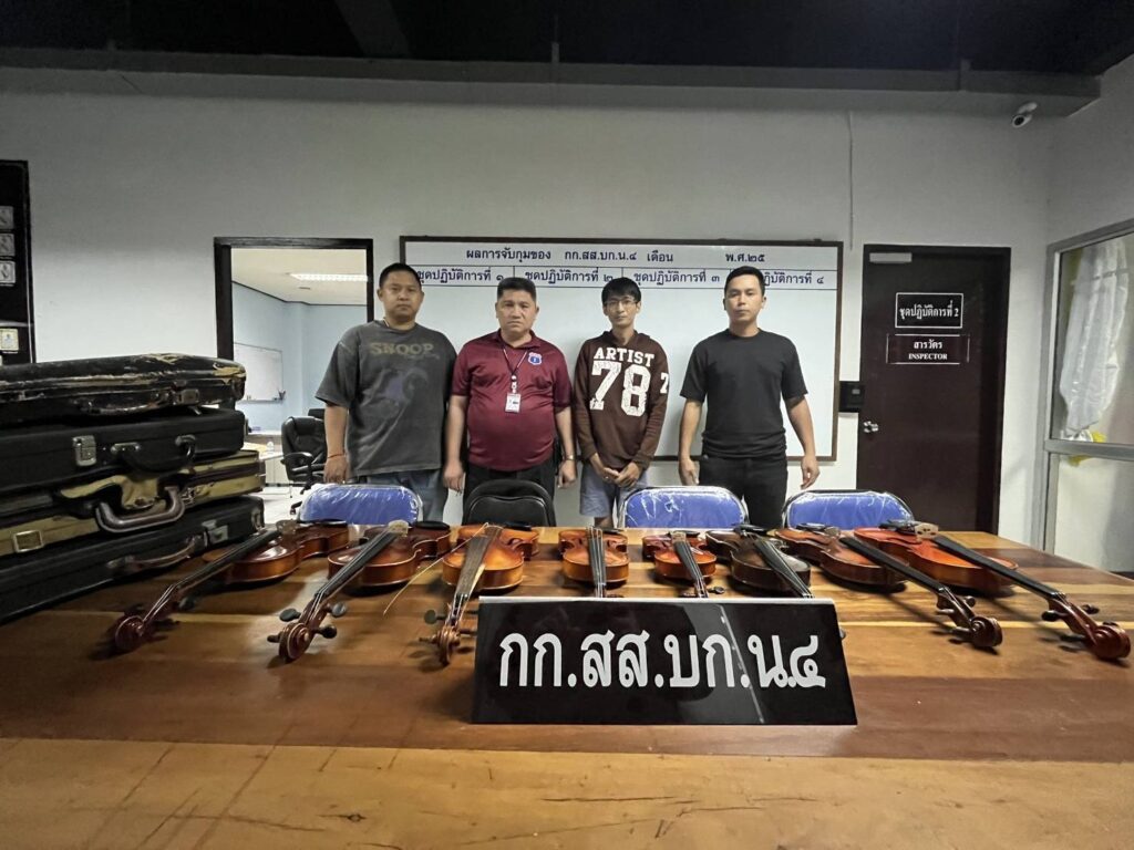 เจ้าหน้าที่ตำรวจจึงได้นำกำลังเข้าตรวจค้นและยึดของกลางเพิ่มเติมได้อีกเป็นจำนวนมาก ทั้ง ไวโอลินโบราณยี่ห้อ Kisosozaki violno co 1720 และ กีตาร์ Yamaha พร้อมกล่อง