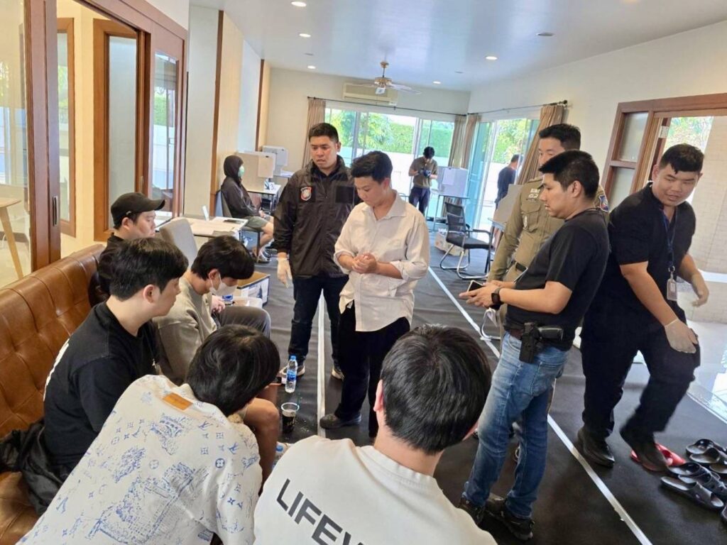 ต่อมาเจ้าหน้าที่ได้ขออนุมัติหมายค้นจาก ศาลอาญาพระโขนง เข้าตรวจค้นบ้านพักหรูย่านแขวงสวนหลวง เขตสวนหลวง กรุงเทพมหานคร พบผู้ต้องหาเป็นชายชาวเกาหลีใต้ 5 คน และชายชาวจีน 1 คน ภายในบ้านถูกจัดเป็นลักษณะคล้ายศูนย์ปฏิบัติการ มีโต๊ะทำงาน 12 โต๊ะ พร้อมอุปกรณ์หูฟัง เอกสารสคริปต์บทสนทนาภาษาเกาหลี รายชื่อและหมายเลขโทรศัพท์เหยื่อจำนวนมาก