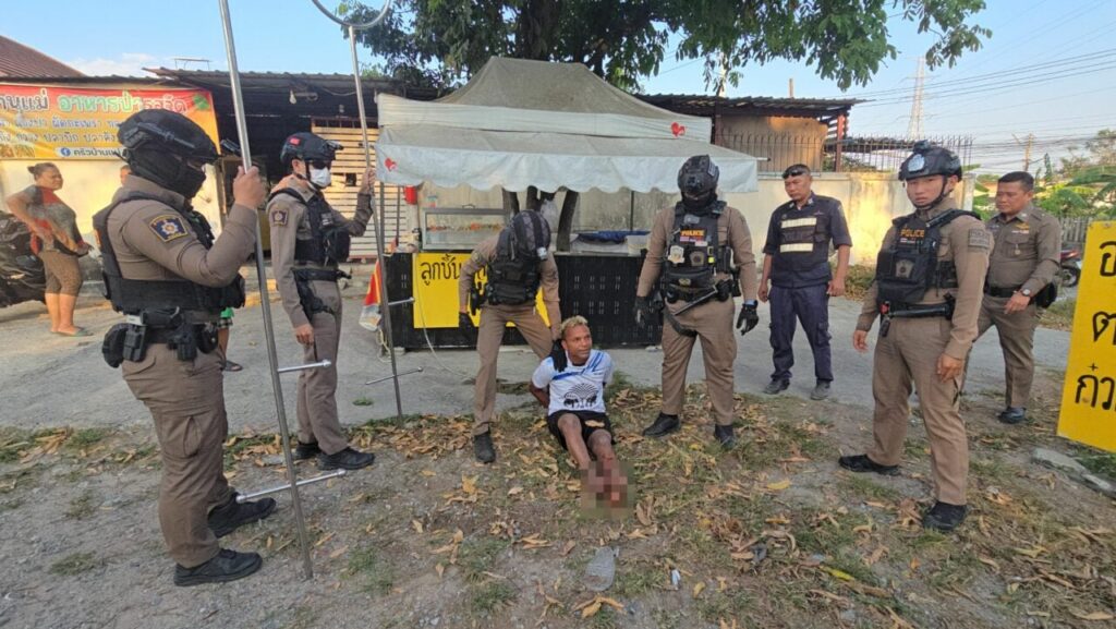 ตำรวจ ศรีราชา ชลบุรี ใช้ไม้ง่าม สยบคลั่ง “อำนาจ รื่นเริง” หรือ เจ้าเพชร อดีตแชมป์มวยโลกชื่อดัง หลังชาวบ้านแจ้งความข้อหาบุกรุก ทุบรถ ก่อนใช้มีดจี้หน้าอกตัวเอง