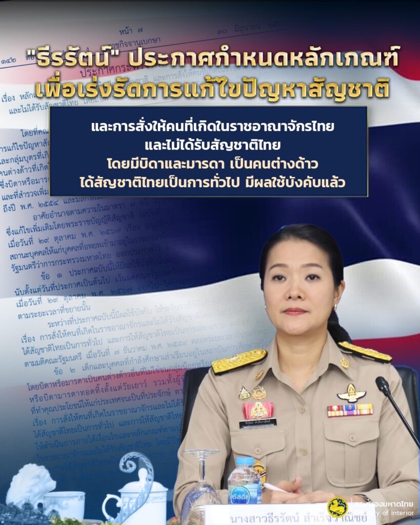 น.ส.ธีรรัตน์ กล่าวว่า ตนได้ลงนามประกาศกระทรวงมหาดไทย เรื่อง หลักเกณฑ์เพื่อเร่งรัดการแก้ไขปัญหาสัญชาติ และการสั่งให้คนที่เกิดในราชอาณาจักรไทยและไม่ได้รับสัญชาติไทย โดยมีบิดาและมารดาเป็นคนต่างด้าว ได้สัญชาติไทยเป็นการทั่วไป ซึ่งได้ประกาศในราชกิจจานุเบกษาและมีผลใช้บังคับแล้ว ตามที่กระทรวงมหาดไทยโดยกรมการปกครองเสนอ ซึ่งมีสาระสำคัญ คือ กำหนดให้ปลัดกระทรวงมหาดไทยรักษาการตามประกาศนี้ และให้มีอำนาจวินิจฉัยปัญหา และแก้ไขอุปสรรคเพื่อปฏิบัติการให้เป็นไปตามประกาศฯนี้ และได้กำหนดระยะเวลาการใช้บังคับประกาศฯ เป็นระยะเวลา 1 ปี นับตั้งแต่วันที่ประกาศเป็นต้นไป เว้นแต่ ครม. จะมีมติให้ขยายระยะเวลาใช้บังคับออกไป รวมทั้งการกำหนดเงื่อนไขและหลักเกณฑ์การขอสัญชาติไทยของกลุ่มเป้าหมายตามมติ ครม. ดังกล่าว