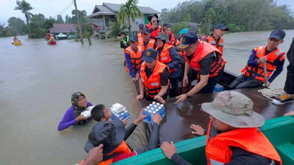 นายวีรพัฒน์ บุณฑริก รองผู้ว่าราชการจังหวัด รักษาราชการแทนผู้ว่าราชการจังหวัดนราธิวาส พร้อมด้วย ทพญ.ปิยนาถ บุณฑริก รองนายกเหล่ากาชาดจังหวัดนราธิวาส และสมาชิกเหล่ากาชาดจังหวัดนราธิวาส , นายอำเภอเมืองนราธิวาส ตลอดจนจิตอาสาพระราชทาน 904 และชุดควบคุมสันติสุข ที่407 และหน่วยทหารพัฒนา ลงเรือท้องแบนติดเครื่องยนต์ ลำเลียงข้าวกล่อง และน้ำดื่ม จากครัวกาชาด นำไปแจกจ่ายให้กับชาวบ้าน ผู้ประสบภัยอยู่ภายใน ไม่สามารถออกมาได้เนื่องจากระดับน้ำสูงกว่า 2 เมตร